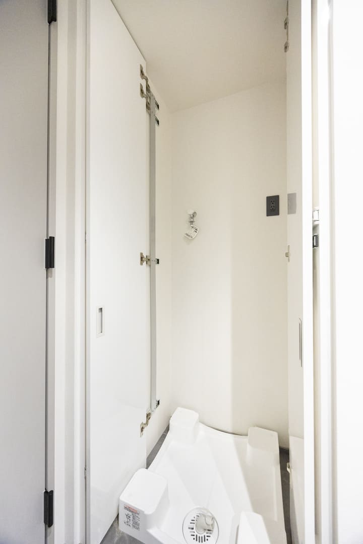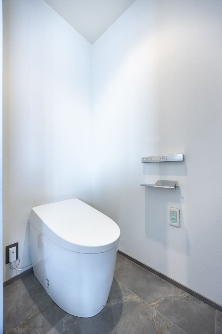 ウォシュレット一体型のトイレです。タンクレスタイプなのですっきりとした印象に。また、別途で手洗い器や鏡が造られているので、その場でサッと身だしなみを整えることができます。
