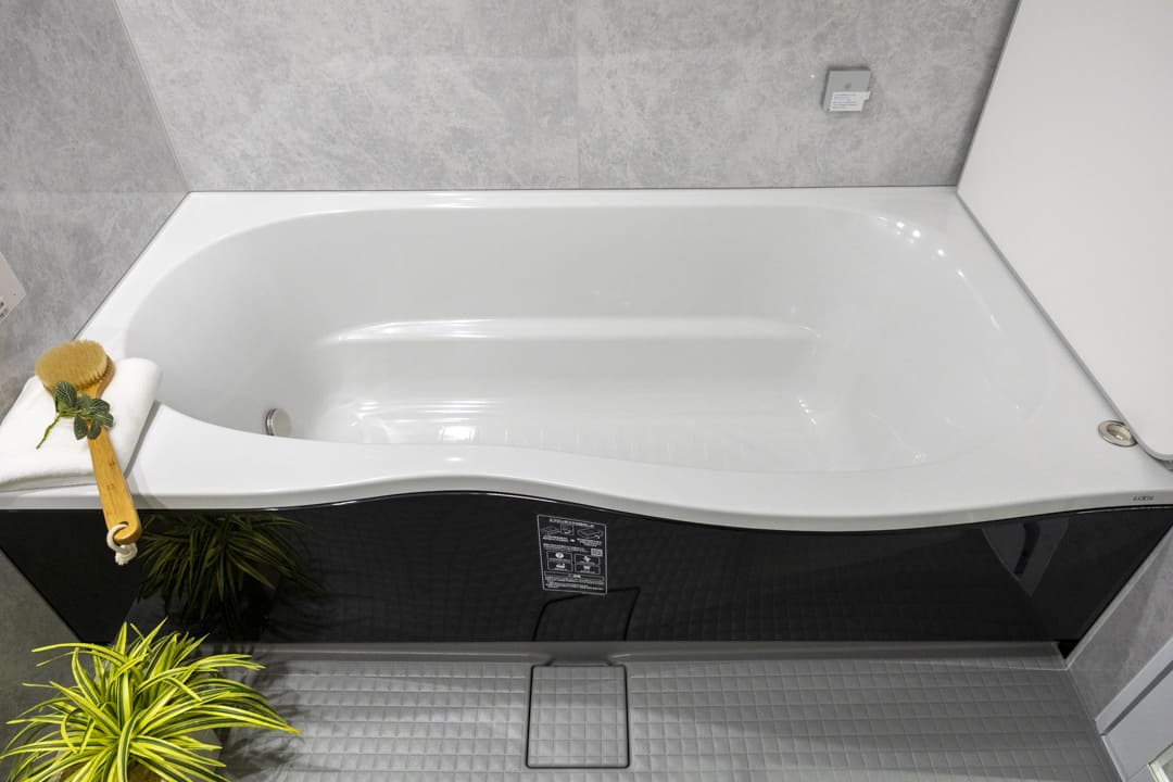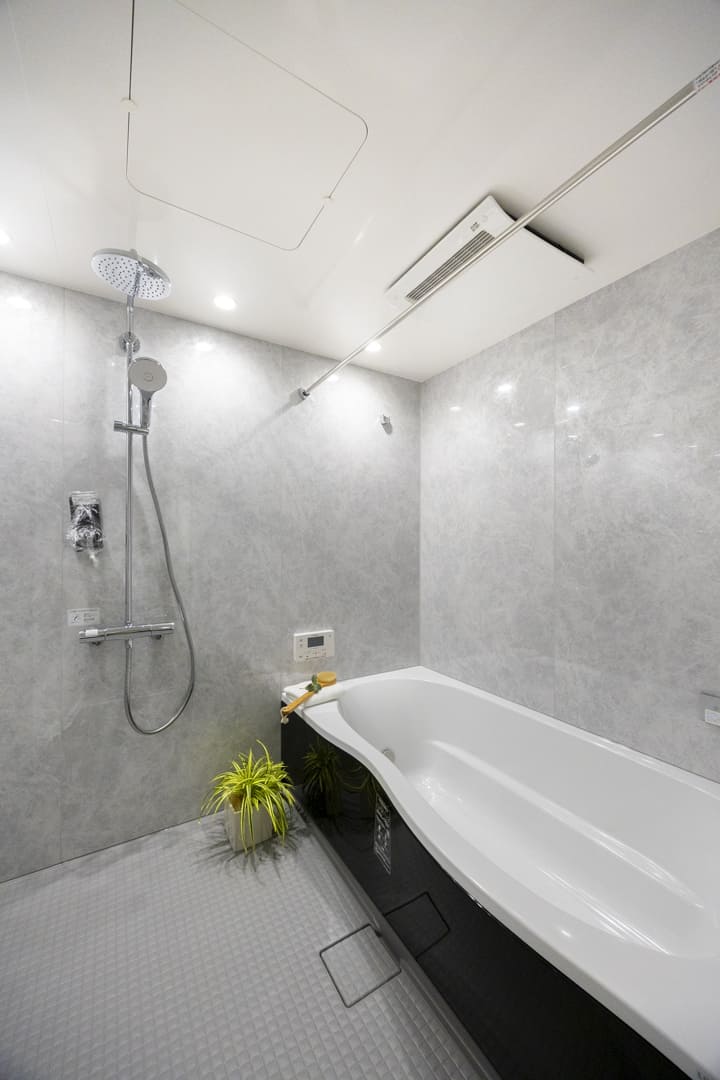 スタイリッシュな雰囲気を漂わせている1620サイズのバスルームです。お風呂にゆっくり浸かるのが好きという方に嬉しい追い焚き機能を搭載。家族の入浴時間がずれてしまっても安心です。また、浴室乾燥機には暖房・乾燥・換気・涼風の機能がついており、一年中快適に過ごすことができます。さらに、オーバーヘッドシャワーが付いているのでたっぷりと全身で湯を浴びることができます。リラックス効果や保温効果もあって◎。