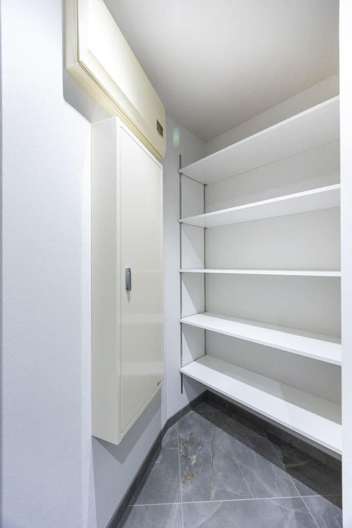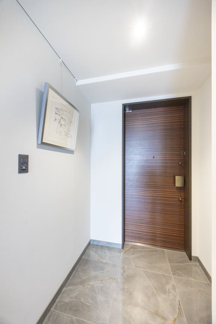 石目調のフロアが高級感を演出している玄関です。入って左側にはシューズインクローゼットが造られており、靴やベビーカーなどの荷物が収納できます。また、壁面にはピクチャーレールが設置されているので、壁を傷つけずに絵画やグリーンなどを飾ることができます。