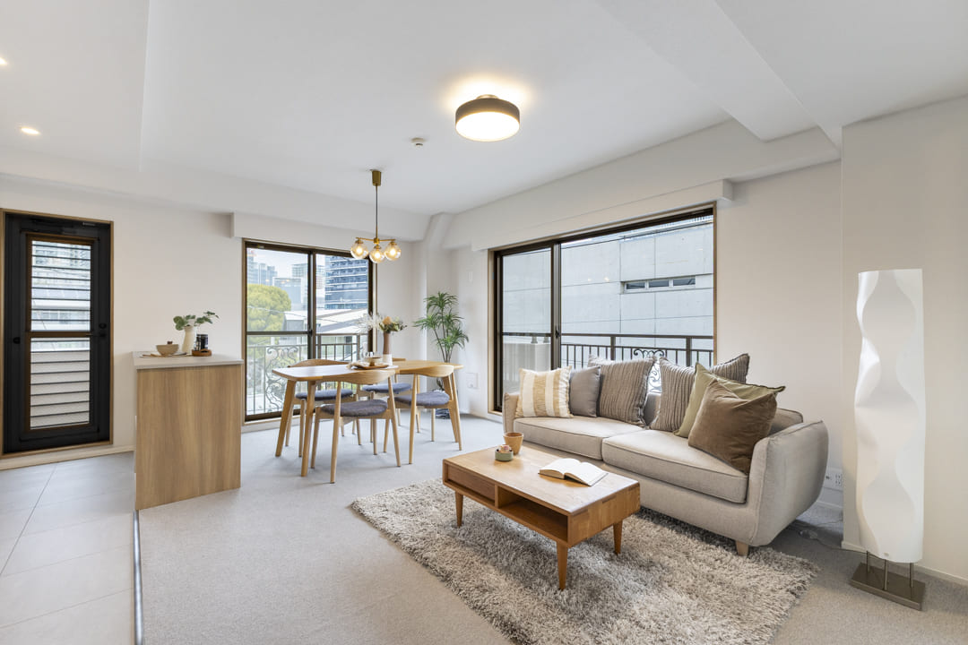 JR山手線他複数路線が利用可能な「大崎」駅より徒歩5分。交通利便性に優れた立地に佇む、新耐震基準マンションです。1996年竣工の地上6階建、総戸数25戸。2025年には大規模修繕工事を実施済みで、管理体制も良好です。ご紹介するお部屋は4階部分、専有面積65㎡の3LDK。全居室に窓を備えた角住戸のため、通風・採光ともに良好です。居室には足ざわりの良いカーペットフロアを採用し、素足でも心地よく過ごせます。LDKはオークとグレーを基調とした落ち着きある内装。L字型バルコニーに面した二面採光により、明るく開放的な寛ぎの空間が広がります。