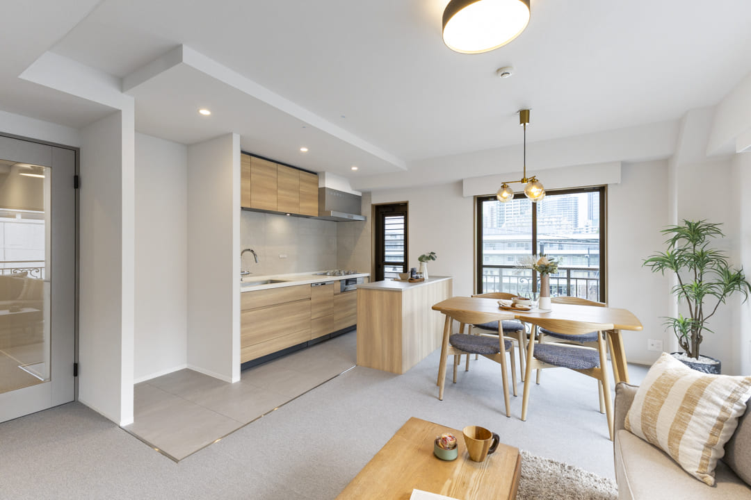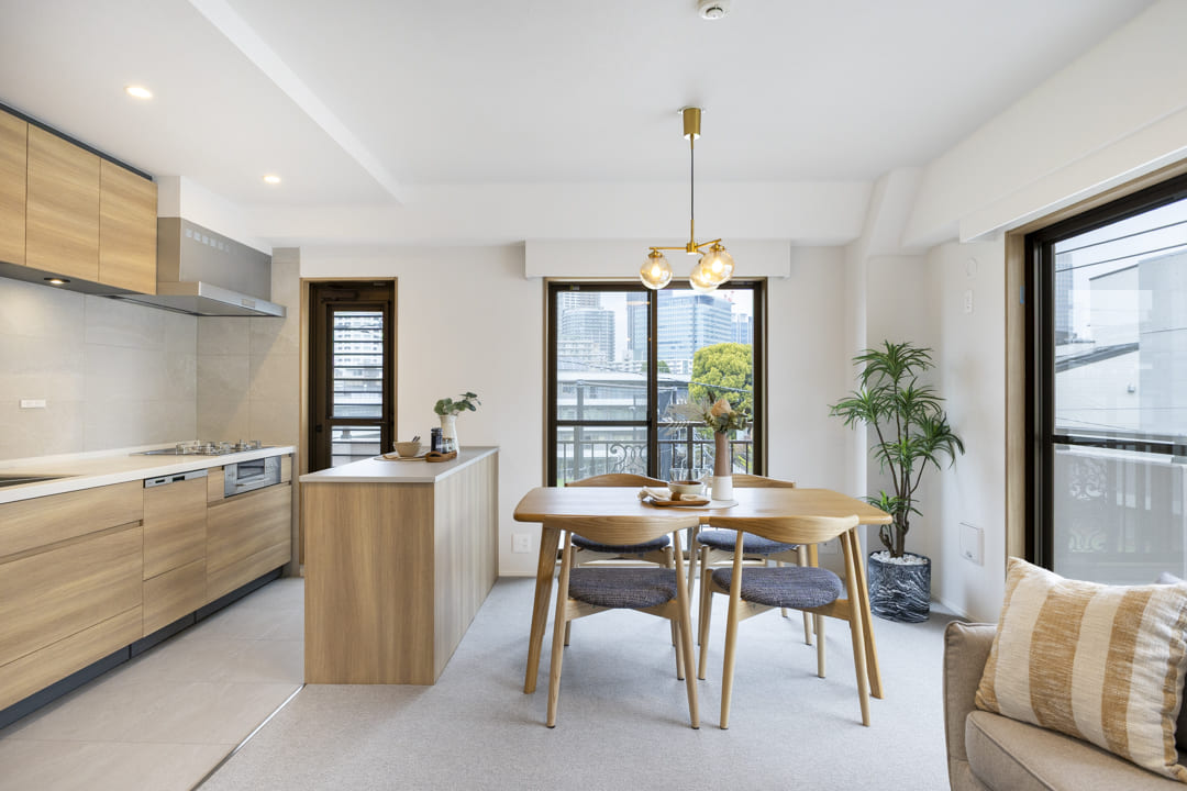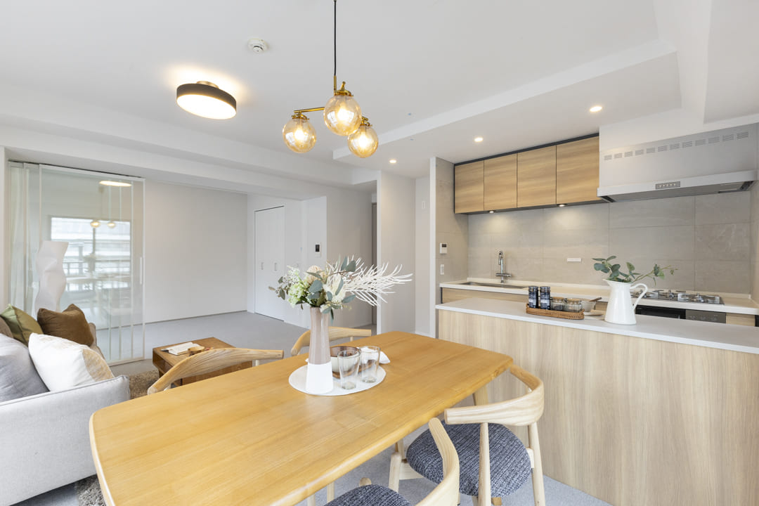 南東・北東のL字型バルコニーに面し、心地よい光がたっぷり降り注ぐリビングダイニング。キッチンスペースを含めて約13.7帖の広さです。隣接する洋室3とはスケルトン仕様の引き戸で仕切られ、開放感と採光を活かした造りが魅力。光と風を感じ、ゆったりと寛げる空間です。