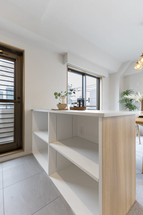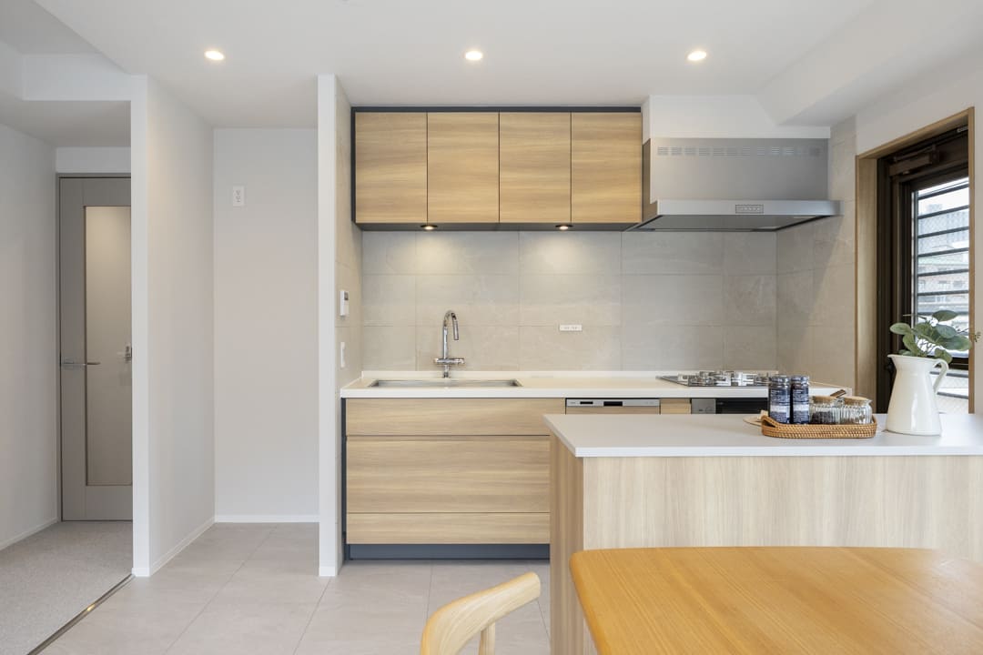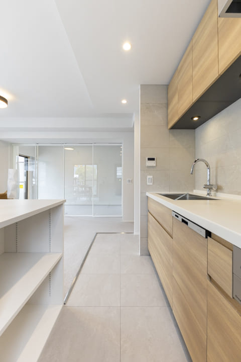 温かみを感じるオーク調のキッチン。壁付けタイプのため、落ち着いて作業に取り組めます。背面には造作カウンターを設け、収納充実。取り出しやすい可動棚仕様ですが、リビング側からは見えず、生活感を目隠しできるのもポイントです。カウンターには完成した料理を置いたり、ちょっとした作業スペースとしても活躍しそうです。