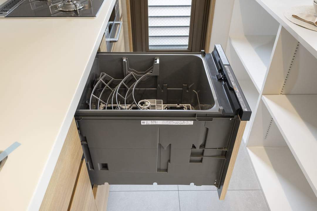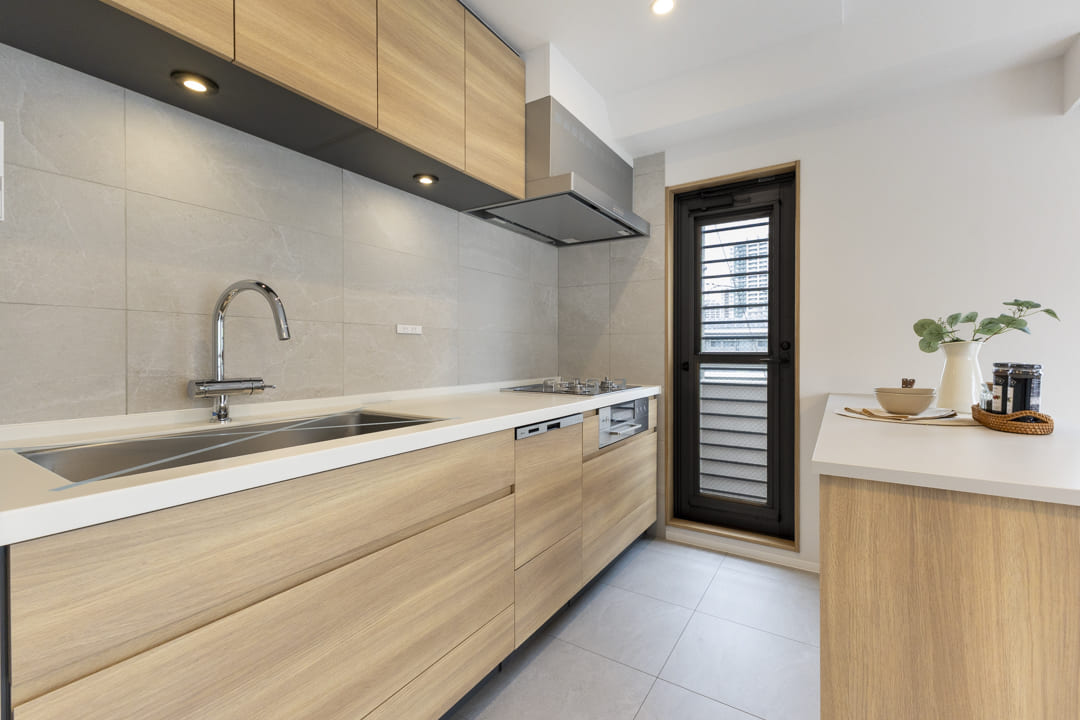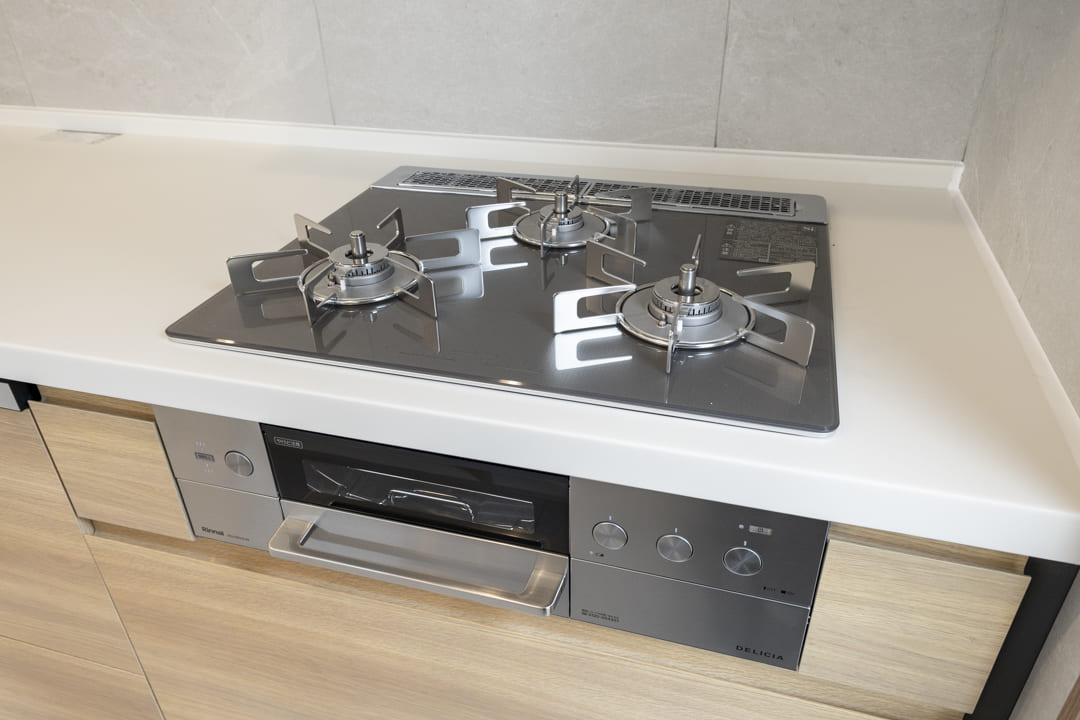 調理の際に手軽においしい水を使用できる浄水器一体型水栓や、同時調理の叶うグリル付3口ガスコンロを完備。食洗機も内蔵されていて、後片付けが捗ります。設備が充実していて快適なキッチン時間になりそうですね。