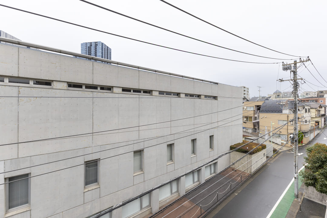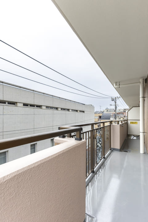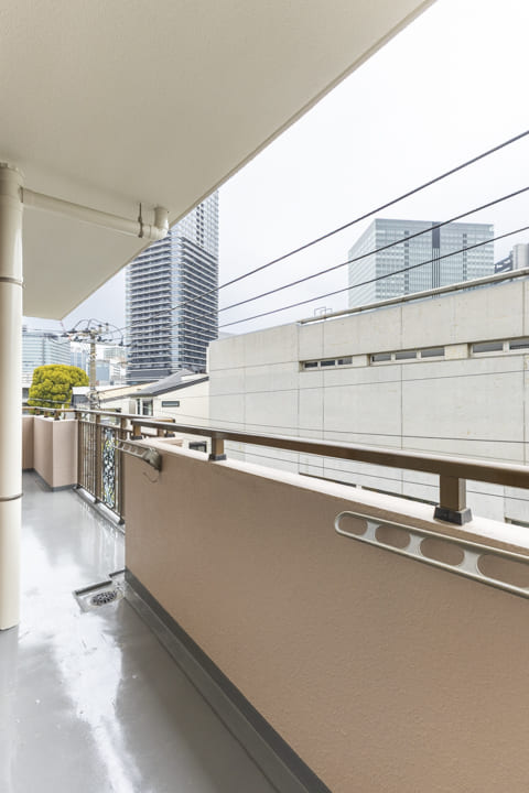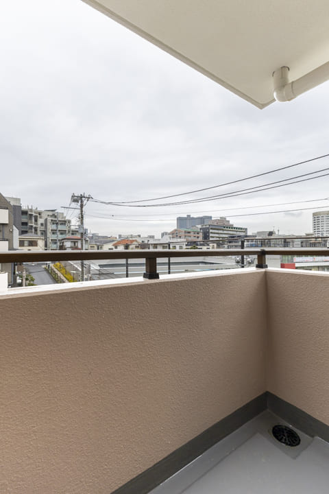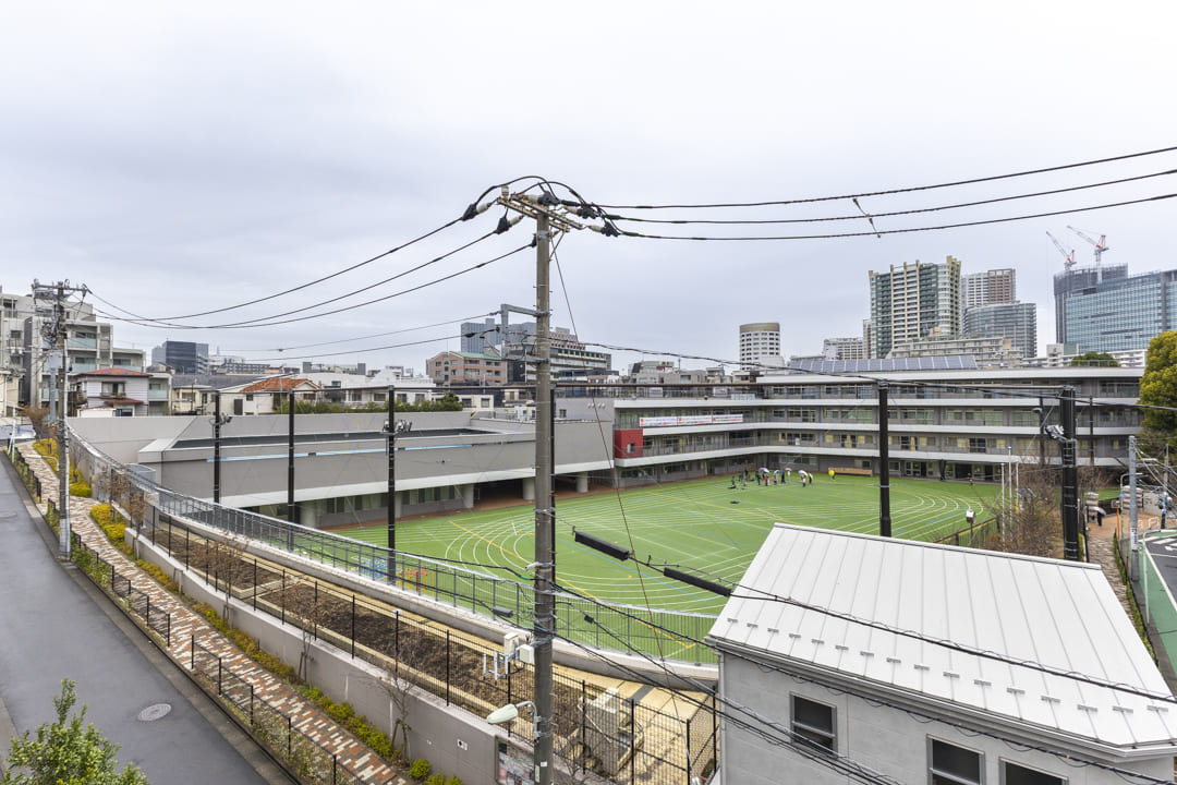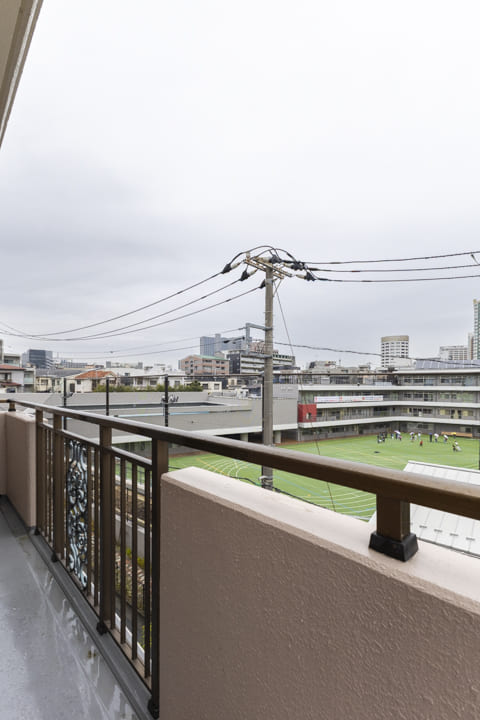 南東~北東側を囲むL字型のバルコニー。洋室3・LDK・洋室2に面しています。北東側には「芳水小学校」のグラウンドを望み、周囲に高い建物が少ないため、遠くまで広がる空を見渡せる開放的な眺めが広がります。