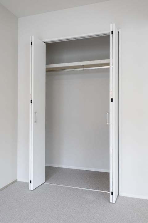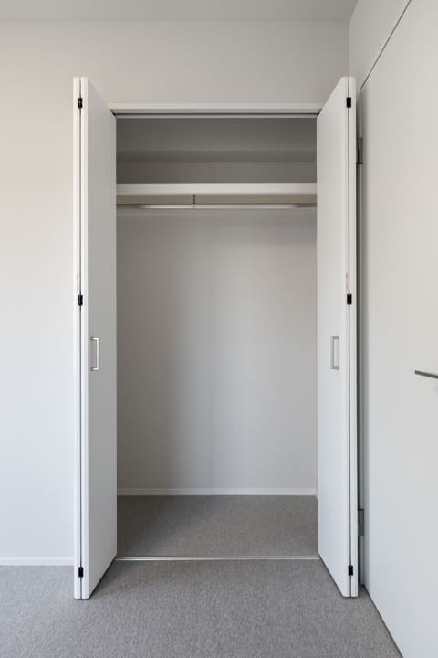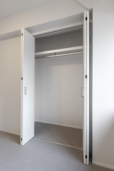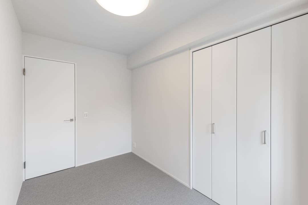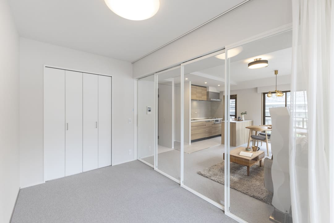 LDKに隣接する約5.1帖の洋室3。スケルトン仕様の引き戸を採用し、視線の抜けによる広がりと開放感を演出します。カーテンレール付きで、必要に応じて目隠しも可能。拡張リビングや寝室など、ライフスタイルに合わせて柔軟に活用できる一室です。