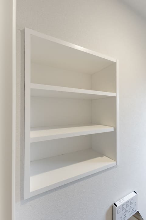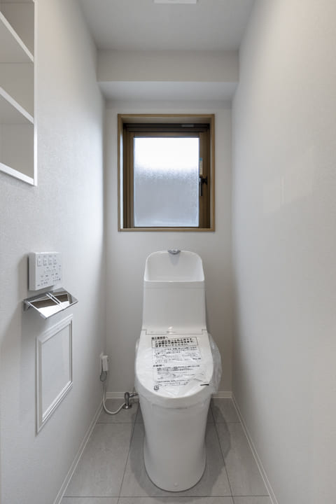 廊下の突き当たりに位置する、独立性の高いレストルーム。窓付きで自然換気が可能です。TOTO製の洗浄機能付トイレに交換済み。収納棚にはトイレットペーパーの収納はもちろん、ディフューザーや小物を飾るなど、空間づくりもお楽しみいただけます。
