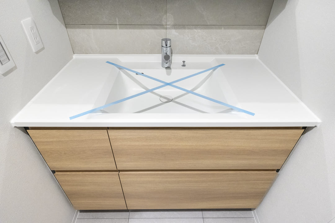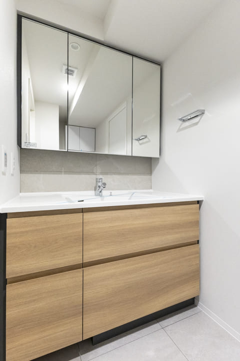キッチンと同じオーク調デザインで、清潔感と温かみを兼ね備えた洗面化粧台。大きな三面鏡付きで身だしなみを整えるのに便利です。大開口の洗面ボウルはカウンターと一体成型のため、汚れが溜まりづらくお手入れのしやすさも魅力です。