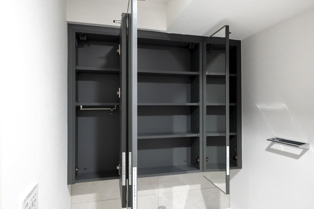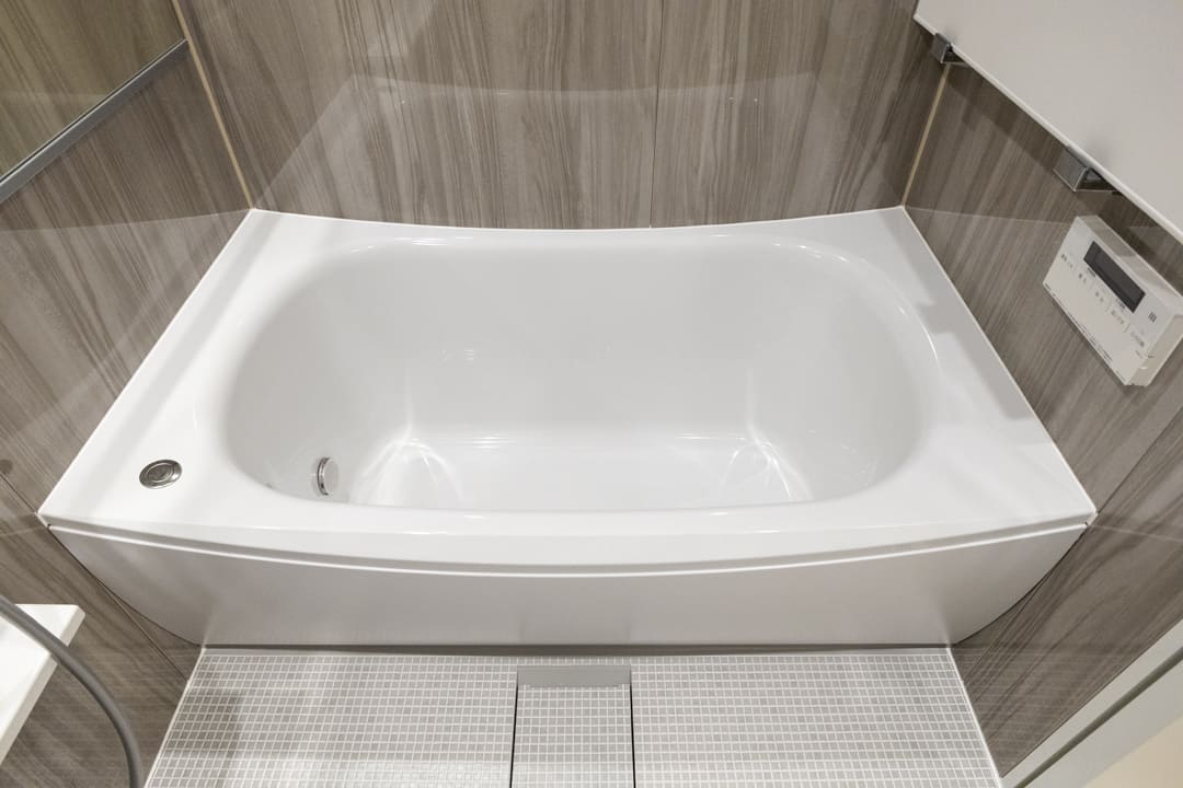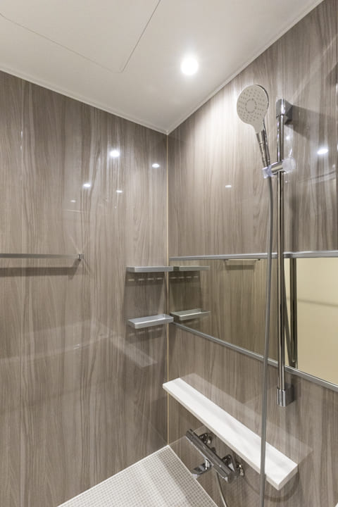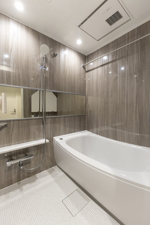 光沢のある木目柄パネルとワイドミラーが上質な雰囲気を演出するバスルーム。換気・暖房・乾燥・涼風機能を備え、季節を問わず快適なバスタイムをお楽しみいただけます。カビ対策や雨の日のお洗濯も安心ですね。お風呂にゆっくり浸かるのが好きという方に嬉しい追い焚き機能も搭載されています。