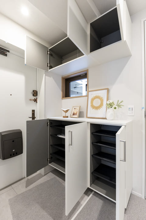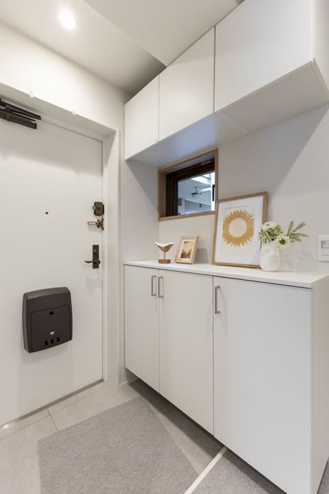 白を基調とした明るい玄関。窓付きで自然換気できるのも嬉しいポイントです。シューズボックスと可動棚を設け、収納も充実。散らかりがちな靴はもちろん、アウトドアグッズなども収納できます。カウンターに小物や季節の花を飾ることで空間に彩りを添えることができます。