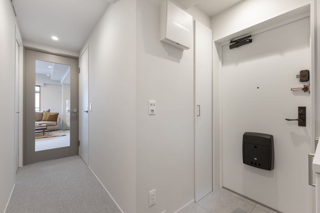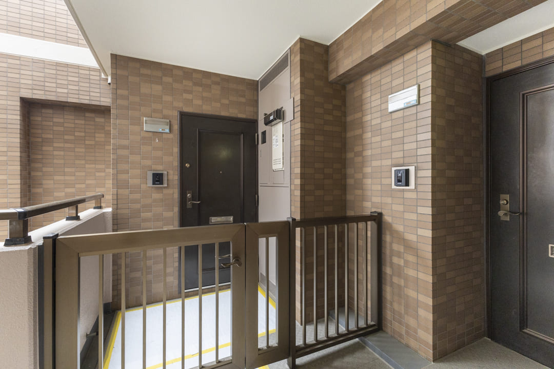 門扉を備えた玄関ポーチを設置。プライバシーを守ることができ、防犯面でも高い効果が期待できます。