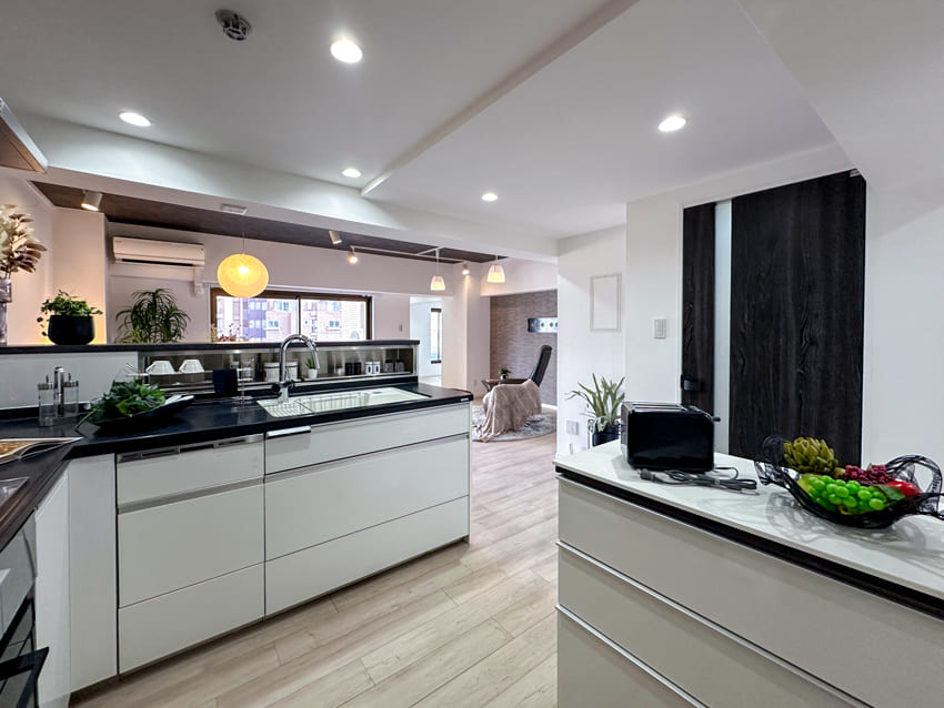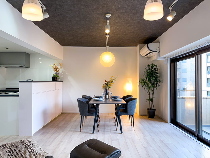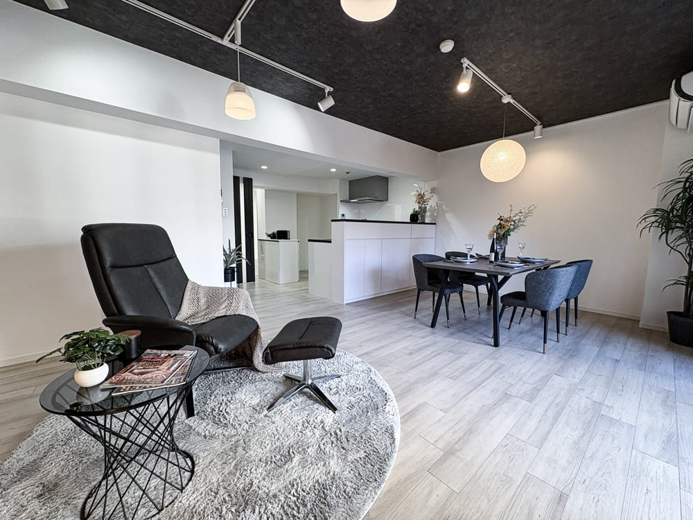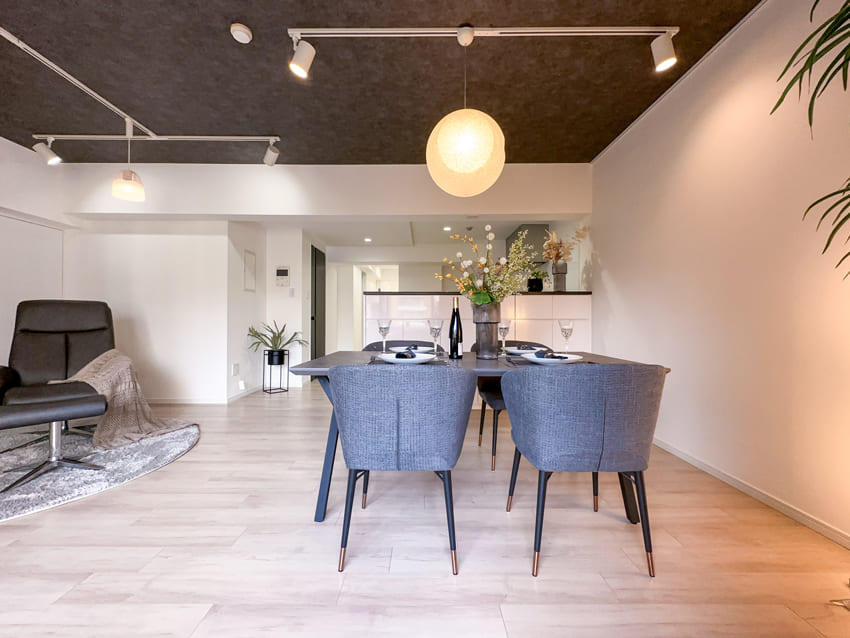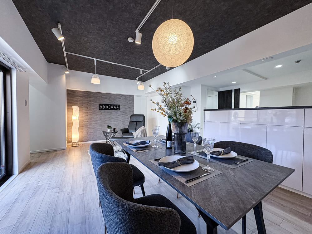 約20.2帖の広々としたリビングダイニングキッチンです。ダークトーンで仕上げられた天井に、ライティングレールを組み合わせた設計。空間を引き締めつつ、視線を上へと誘導することで、実際以上の広がりを感じさせてくれます。また、ダイニングとリビングが緩やかに分かれ、家具配置にも余裕があります。食事・くつろぎ、それぞれの時間を心地よく過ごせるバランスの良さが魅力です。