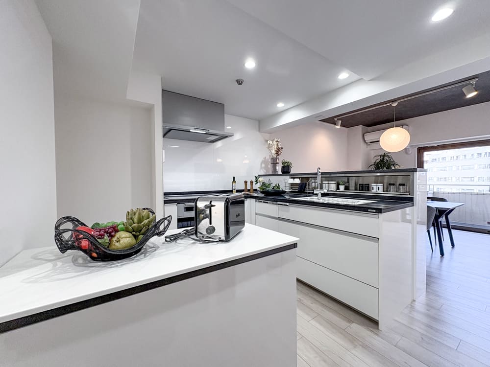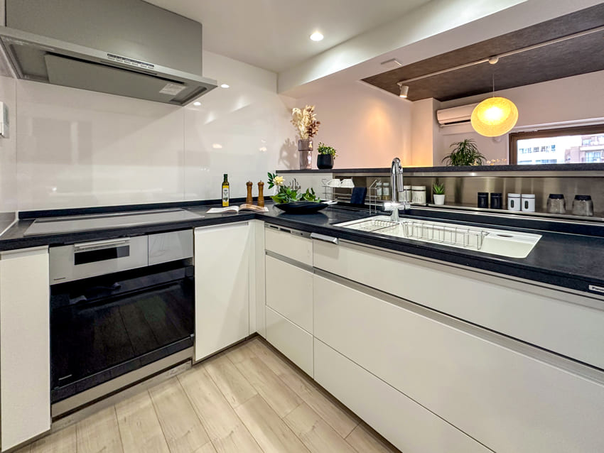 IHクッキングヒーター、グリル、オーブン、食洗機付きと設備面も充実しています。シンク前にはコンセントがあるので、ミキサーなどのキッチン家電も使いやすそうです。