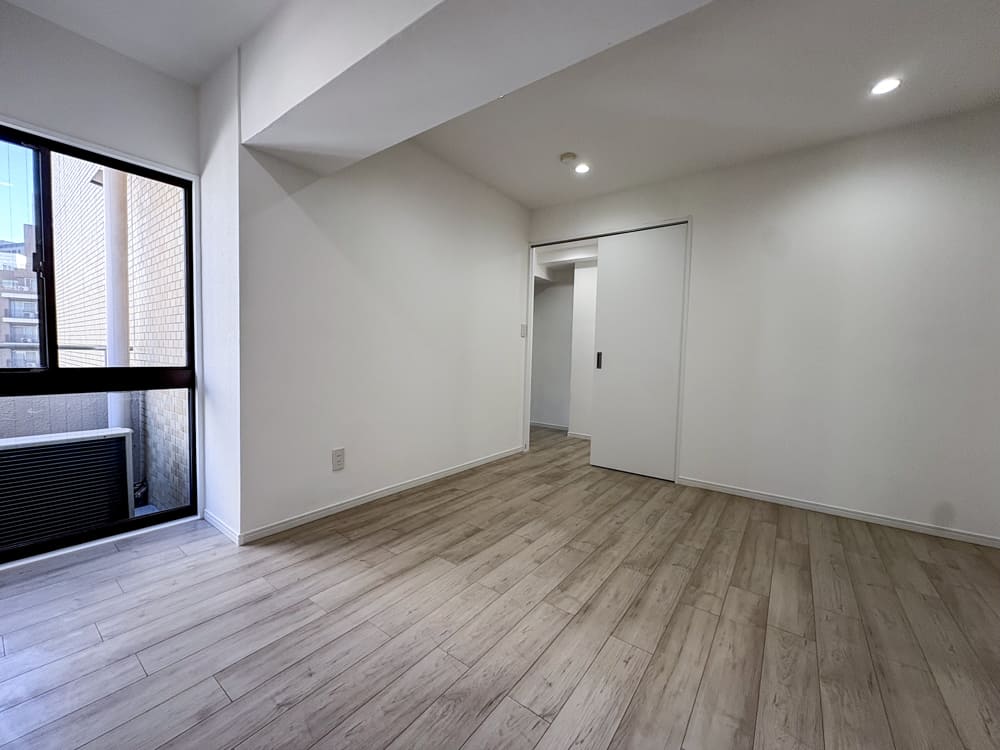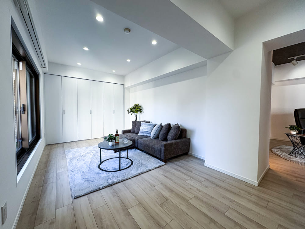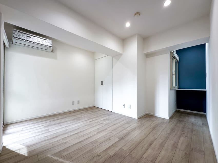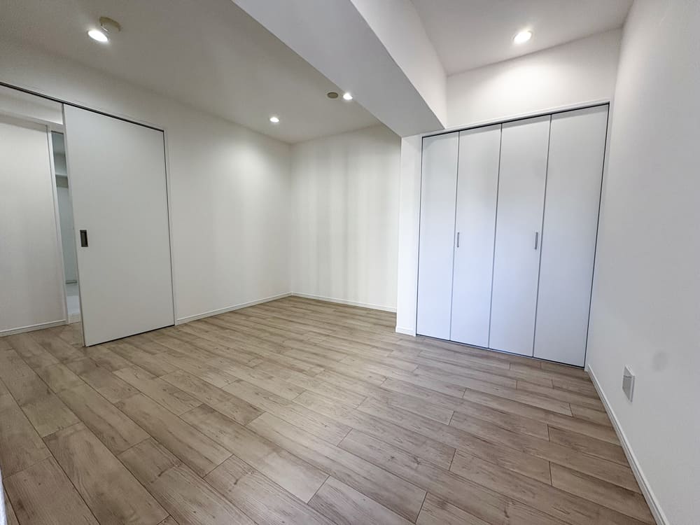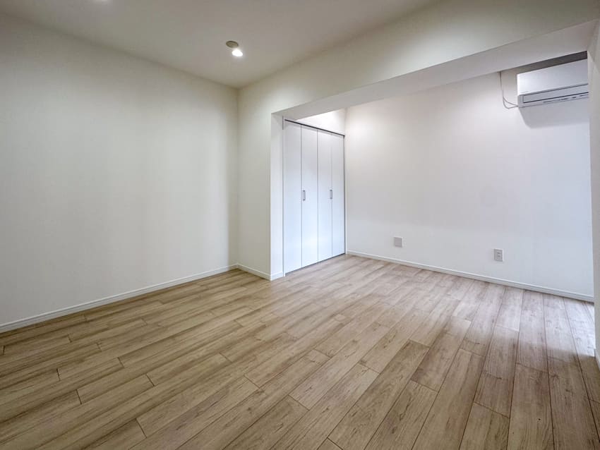 約8.1帖の寝室1はリビングダイニングとの繋がりを感じる空間。壁面にはクローゼットが備え付けられており、収納スペースがしっかりと確保されています。