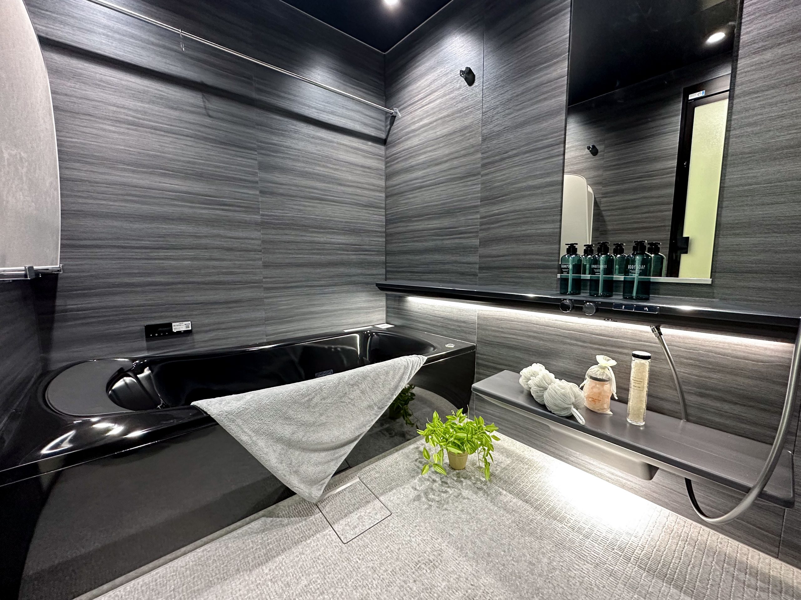 TOTO製のシンラ1620サイズでゆったりと入浴できるバスルームです。お風呂にゆっくり浸かるのが好きという方に嬉しい追い焚き機能を搭載。家族の入浴時間がずれてしまっても安心です。また、ヘッドレストの下と腰の位置からお湯が流れる「楽湯」機能も搭載されていて、全身をしっかり温めることができます。気分や好みに合わせて流量を変えることができ、至福のリラックスタイムになりそうですね。さらに、床洗浄付きで毎日の掃除の負担も軽減できそうです。