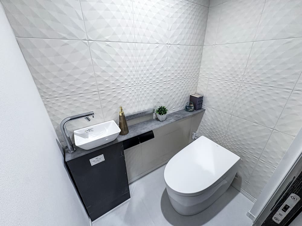 ウォシュレット一体型のトイレです。タンクレスタイプなのですっきりとした印象に。また、別途で手洗い器が造られているので、すぐに手を洗うことができて衛生的です。カウンタースペースにはアロマなどを置いても◎。