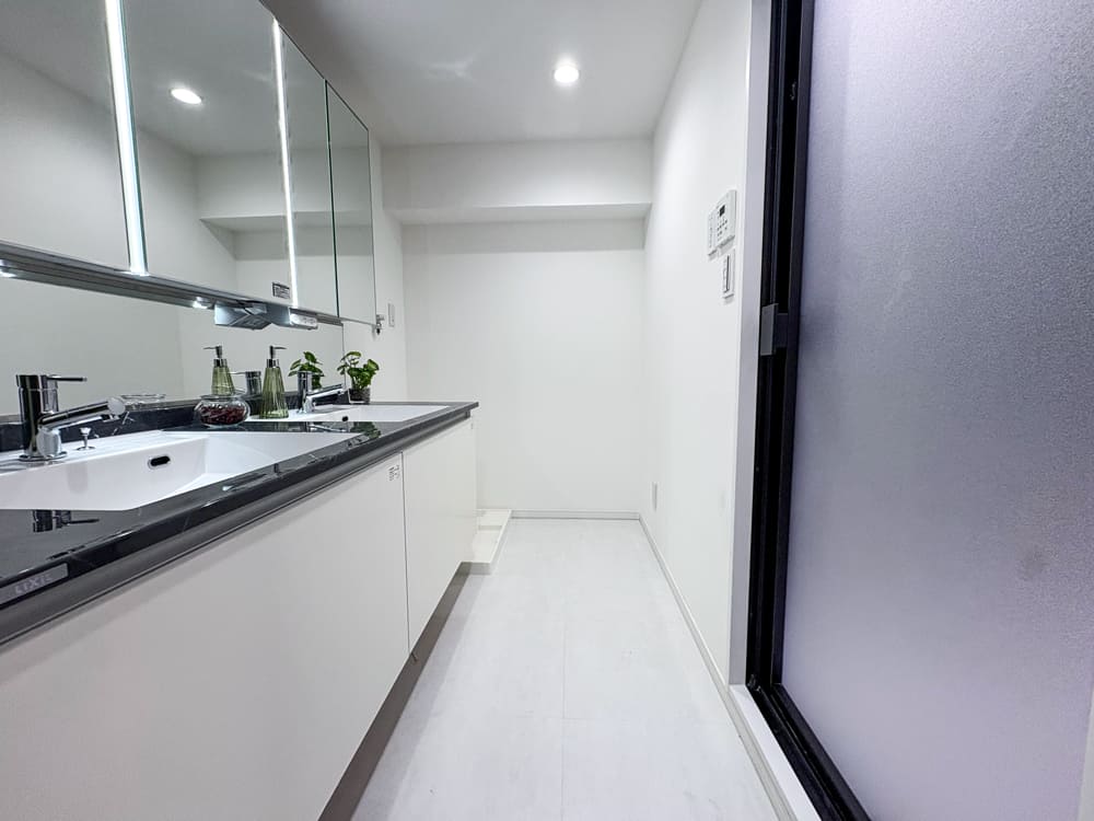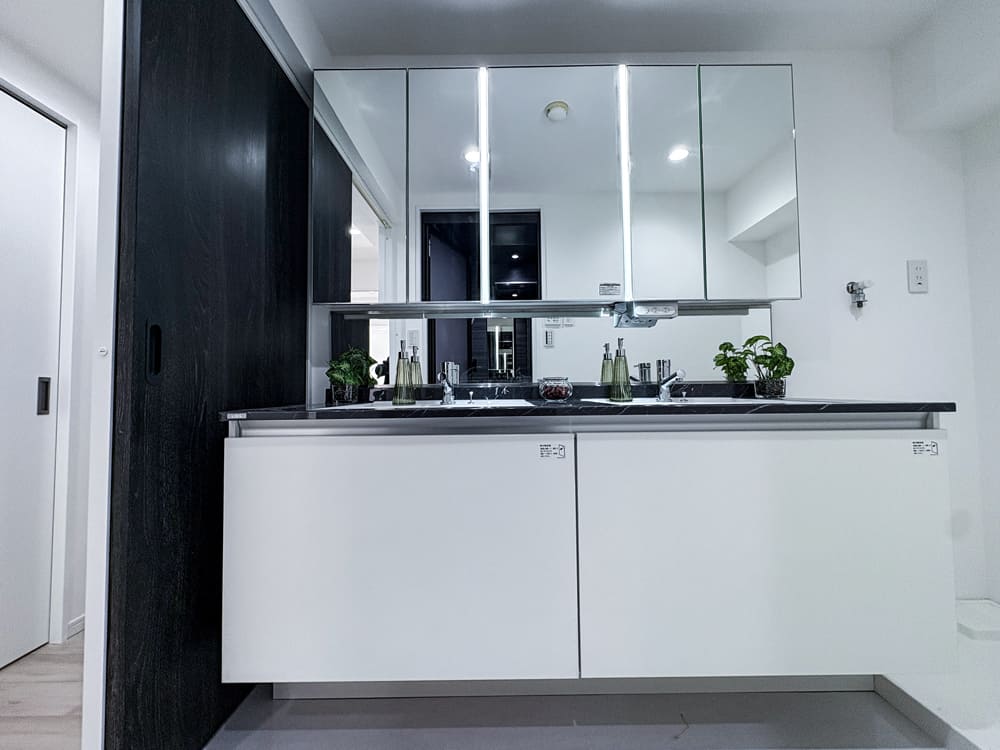 ホテルライクな2ボウル洗面の化粧台です。忙しい朝でも並んで支度ができて使い勝手良好。大きなミラーボックスの中には化粧品などを収納できて便利です。照明が縦に配置されているので、顔に影をつくらないのも◎。