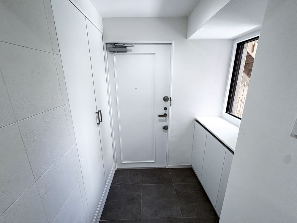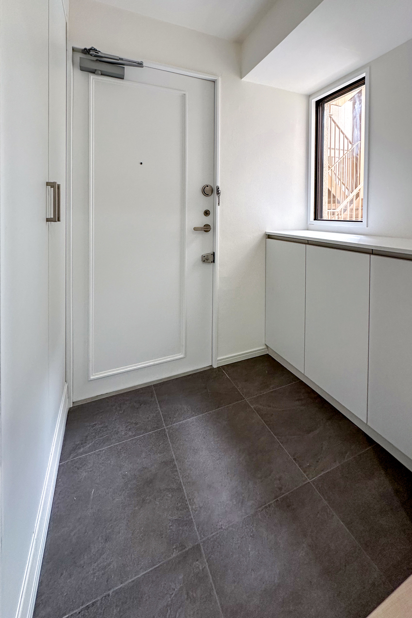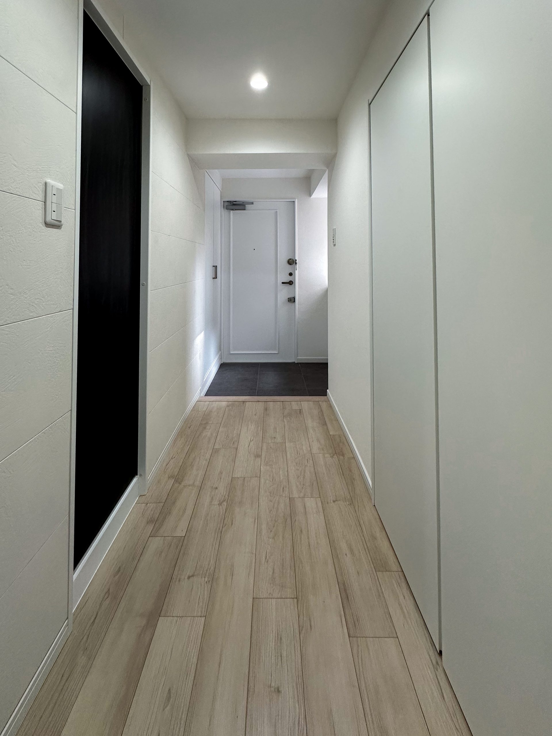 白を基調とした清潔感のある玄関です。窓があって明るさもプラスしてくれています。また、腰高のシューズボックスやシューズインクローゼットが造られており、収納スペースが豊富に確保されていて◎。