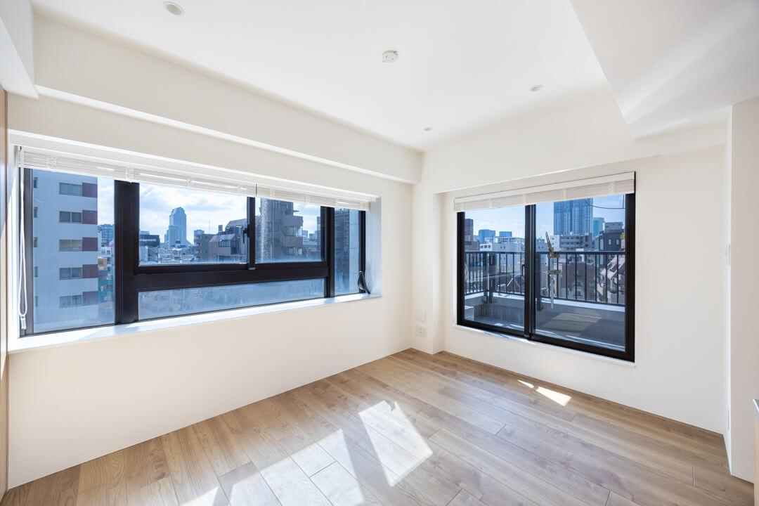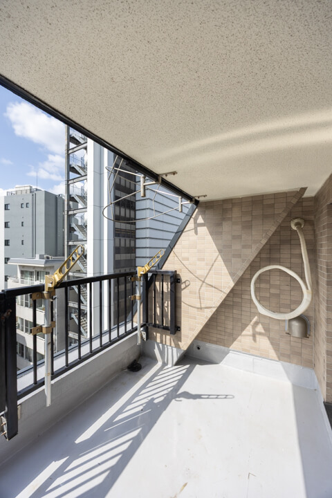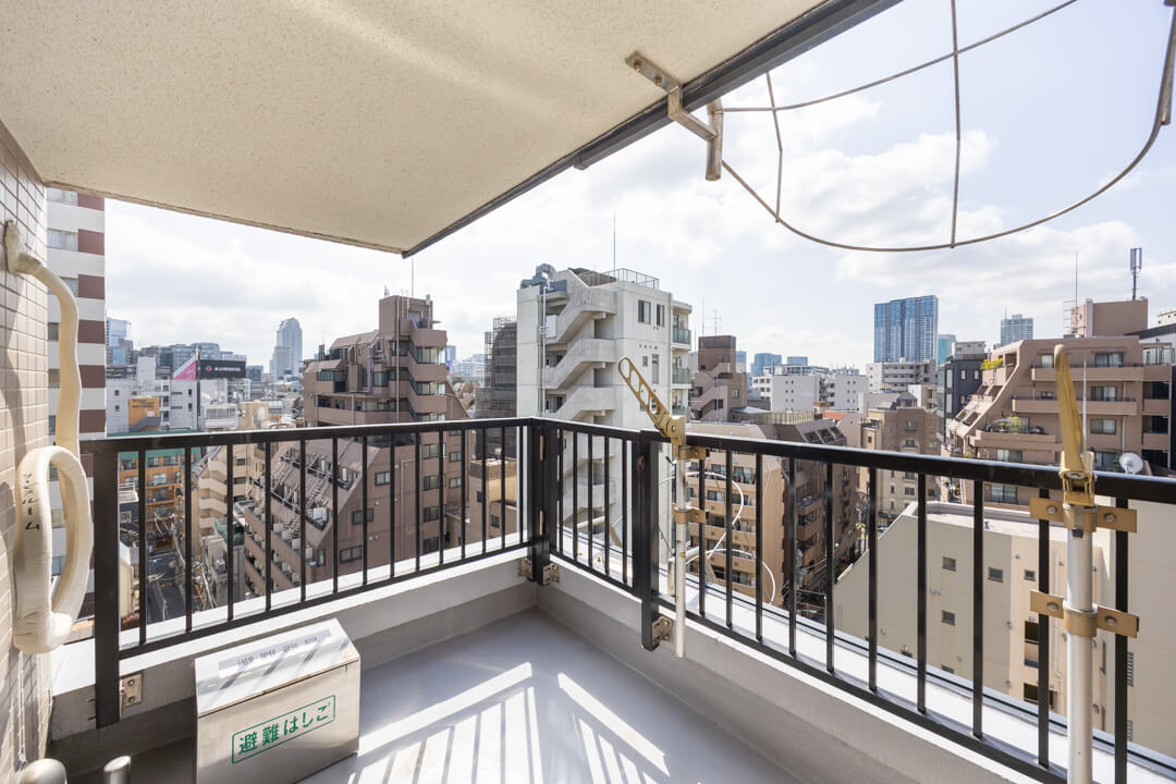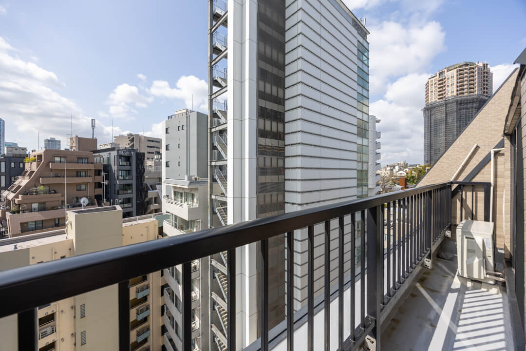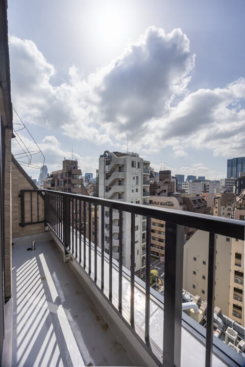 リビングの南側にはバルコニーとルーフバルコニーが付いています。どちらもビル群が望める見晴らしの良い景色です。ルーフバルコニーは奥行きがあり、バルコニーチェアなども置くことができそうです。