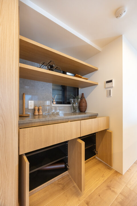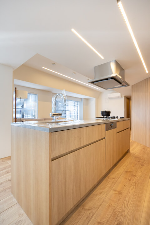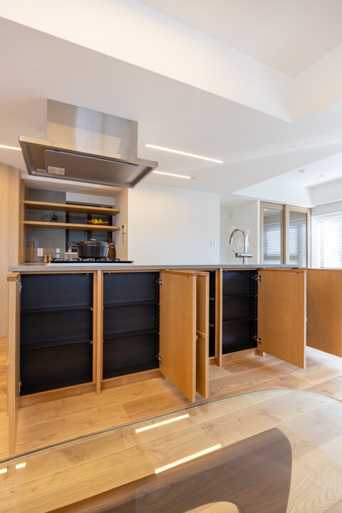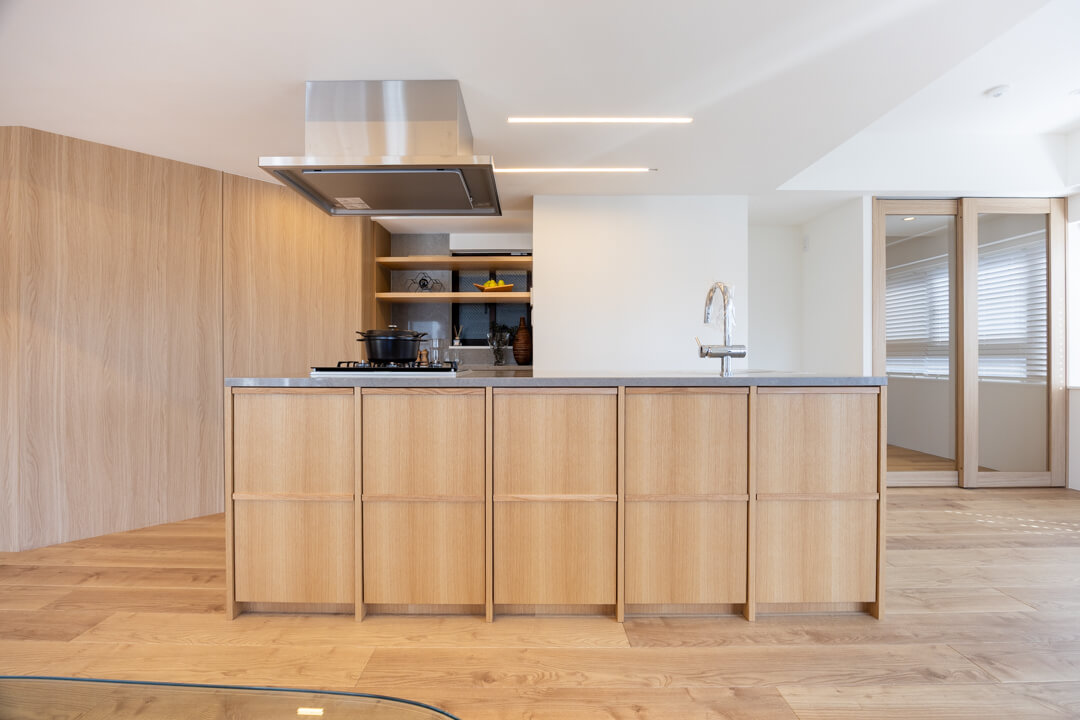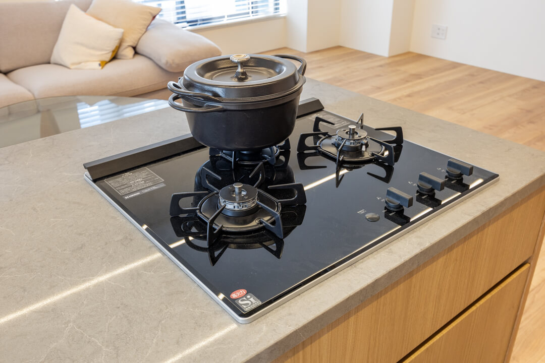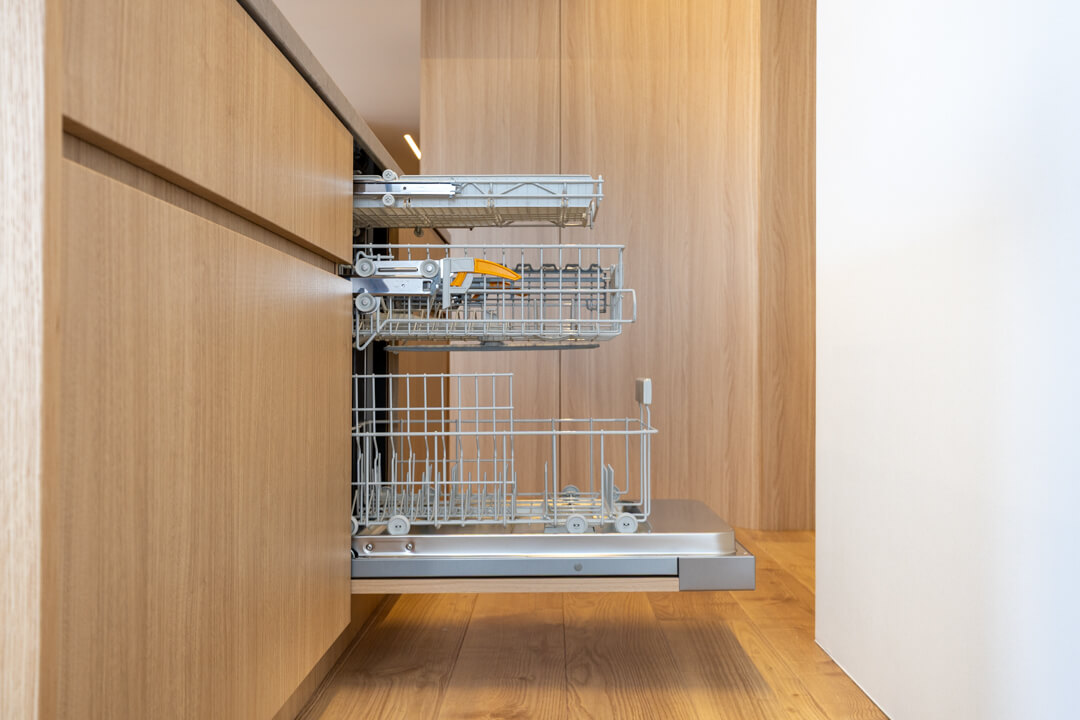 開放感あふれるアイランドキッチン。ウッド調であたたかみがあり、家具のようなデザインがお洒落です。家族やゲストとコミュニケーションが取りやすく、小さなお子さんがいるご家庭では子どもの姿も見守れます。料理が捗る3口ガスコンロ、家事の時短に心強いミーレ製の大型食洗機付きで設備も充実。カップボード付きで収納スペースもしっかりと確保されています。