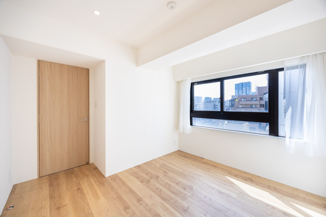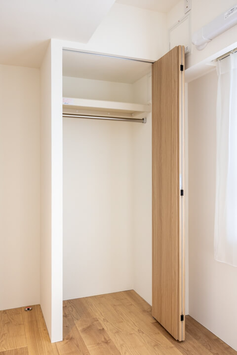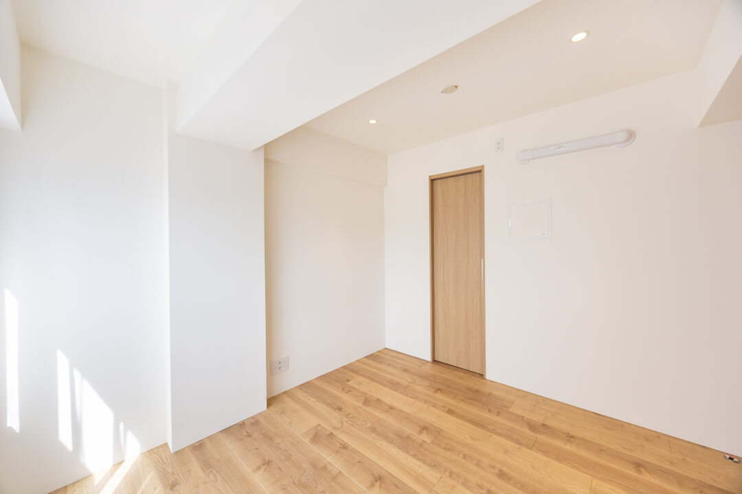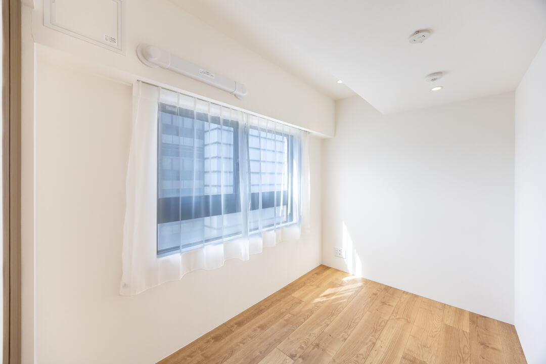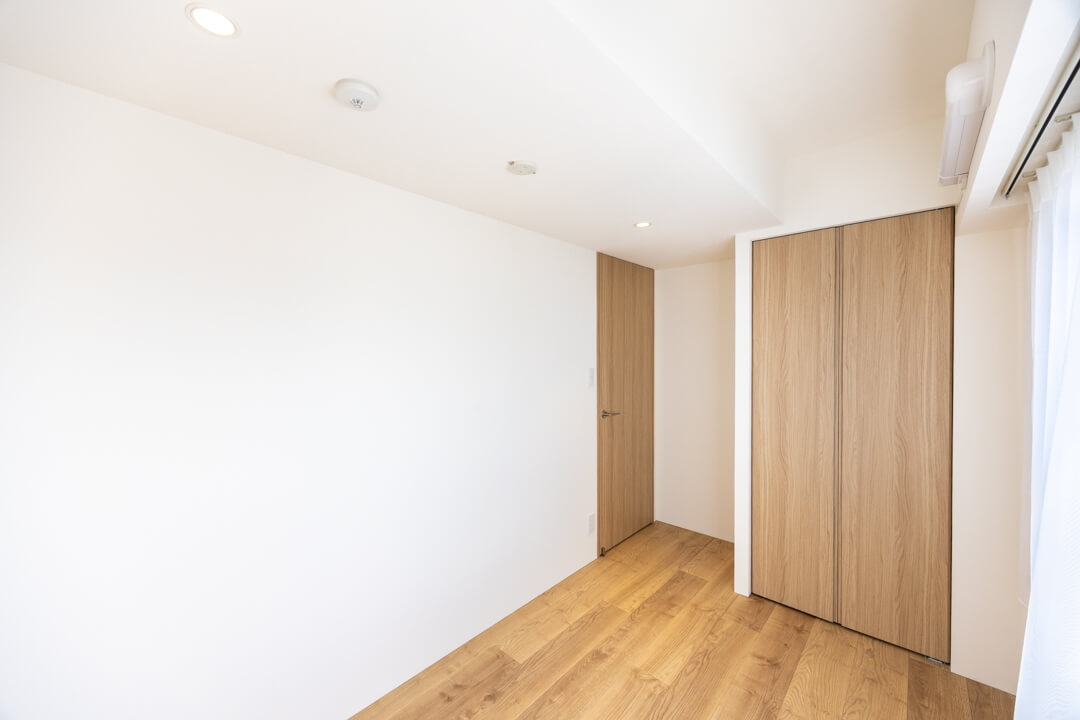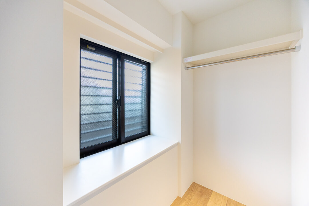 約5.8帖の洋室1。洋室の中で一番広いお部屋です。南向きで陽当り良好。WIC(ウォークインクローゼット)は両サイドにハンガーパイプが付いていて、洋服をたくさん掛けることができます。またクローゼット内には窓も付いていて、空気の入れ替えもスムーズに行えます。WICの照明は自動センサーへの切り替えができるので、電気の消し忘れも防げます。
