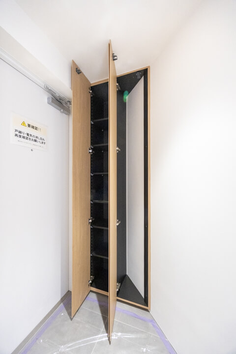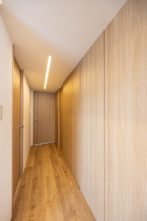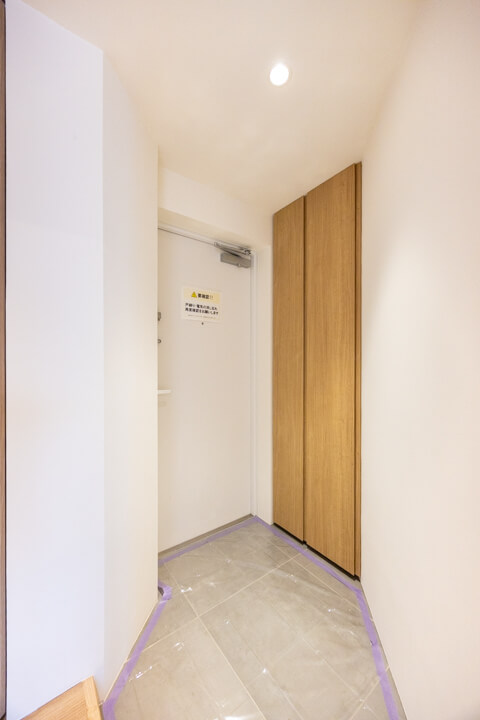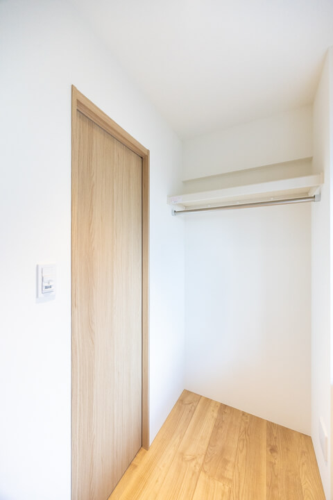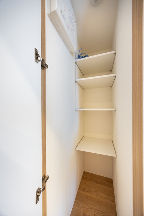 玄関には天井まで高さのあるシューズボックスを完備。さらにホール部分にも収納スペースが備わっています。また、リビング~洋室へと続く通路にも物入が備わっていて、しっかりと収納スペースが確保されています。