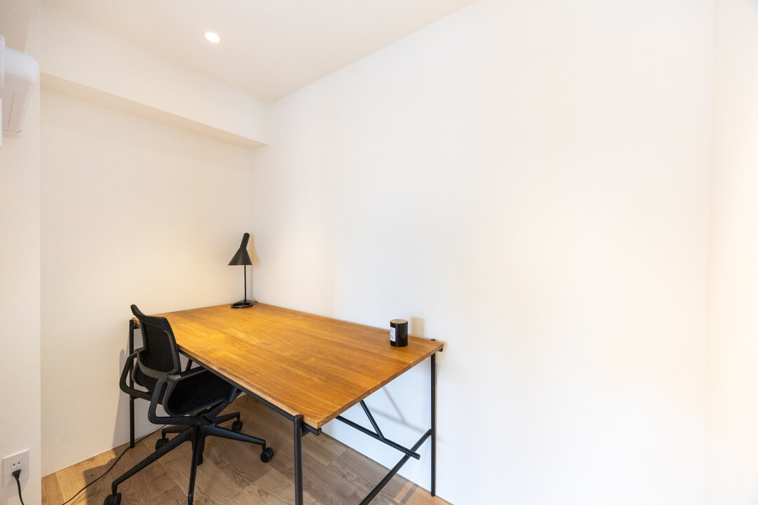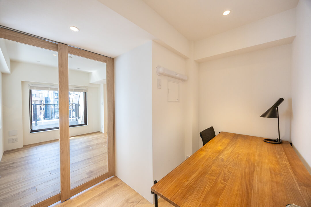 リビングと隣接した約3.3帖のサービスルーム(納戸)。ガラス戸になっていて、扉を閉めった状態でも窮屈感なく過ごせます。ワークスペースや趣味部屋として使いやすいお部屋。エアコンの配管も整っています。