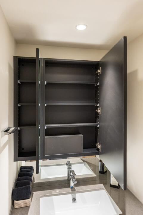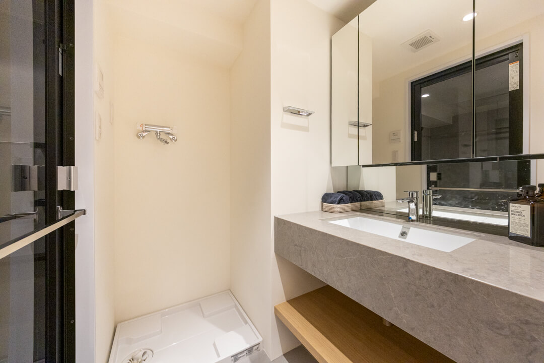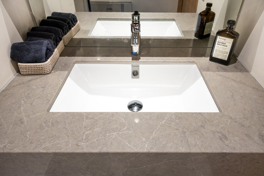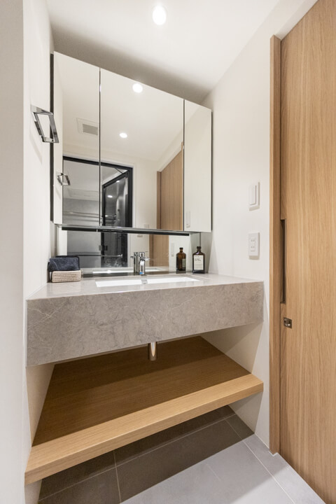 ホテルライクなスタイリッシュなデザインの洗面化粧台。天然石調のカウンターが重厚感があり上品な印象を与えてくれます。また、洗面まわりの小物がすっきり整頓できるミラーボックス付きで、いつでも整った状態をキープできそうです。