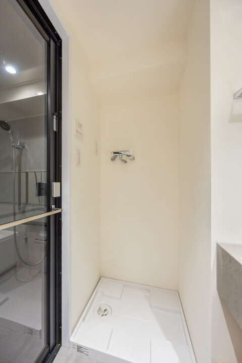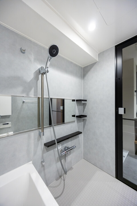 LIXIL製のユニットバスです。グレーベースの空間にブラックのアクセントカラーが印象的なデザイン。追い炊き機能の他、乾燥・換気・暖房・涼風の4つの機能が備わっていて、一年中快適にバスタイムが楽しめます。また、ランドリーパイプも付いていて、雨の日や冬場の洗濯にも困りません。