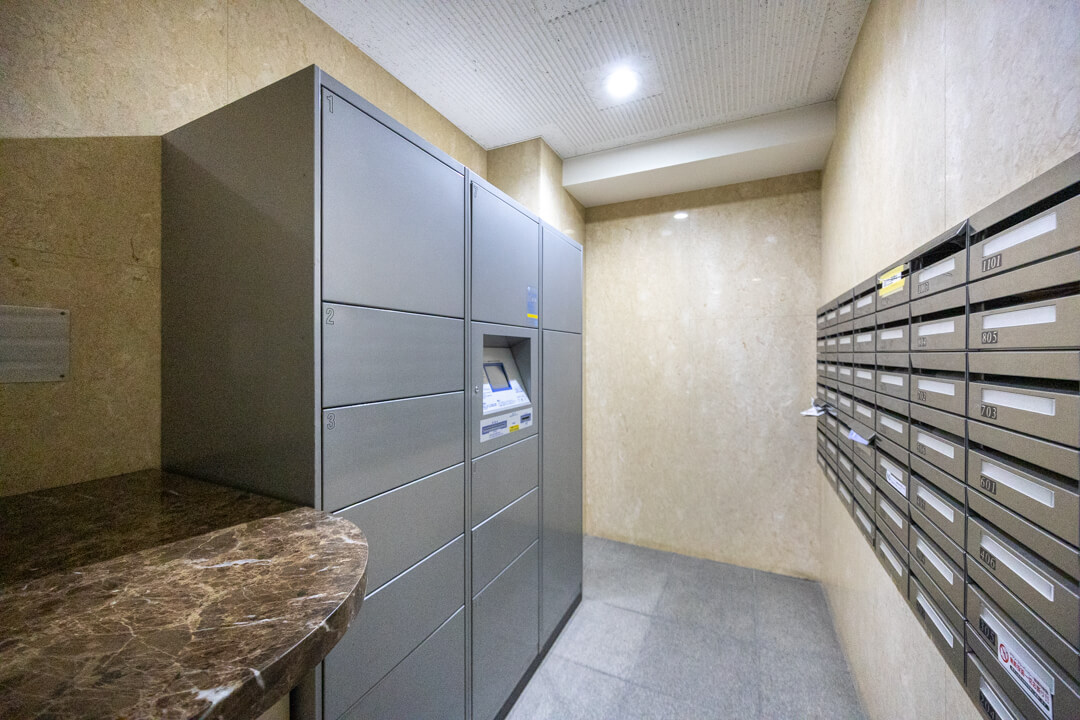 1997年(平成9年)3月に竣工した地上11階建マンション。重厚感の漂うタイル貼りの外観で、手入れされた植栽の緑が彩りを添えています。エントランスは階段を数段降りた場所にあり、スロープも設けられています。安心のオートロック体制で、不在時に重宝する宅配ボックスを完備。広々としたエントランスロビーにはソファがあるので、ちょっとした来客対応や待ち合わせに便利です。
