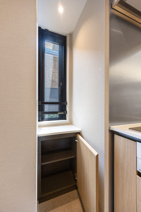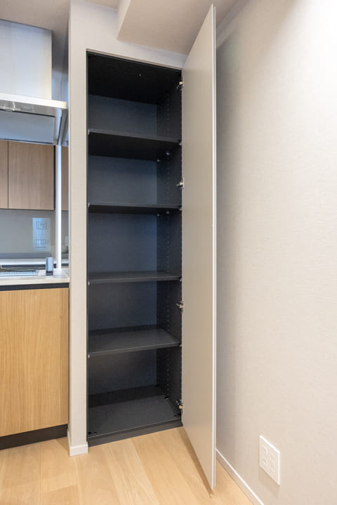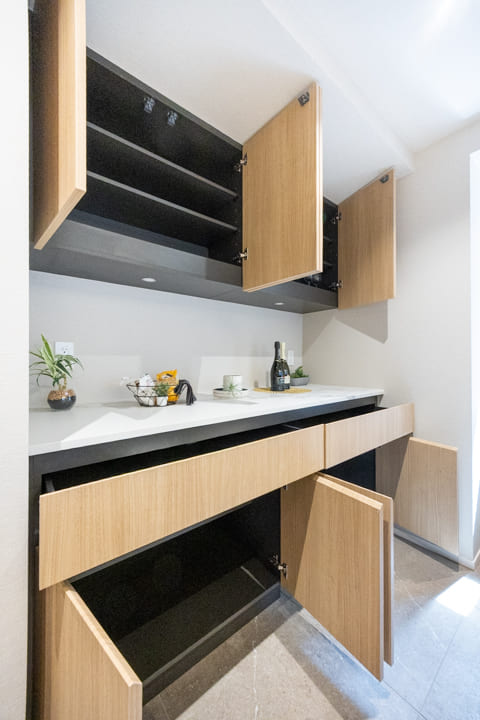 キッチンの背面側にはカップボードが備え付けられています。調味料や食器などを収納できるだけでなく、電子レンジなどを置くこともできるので便利です。