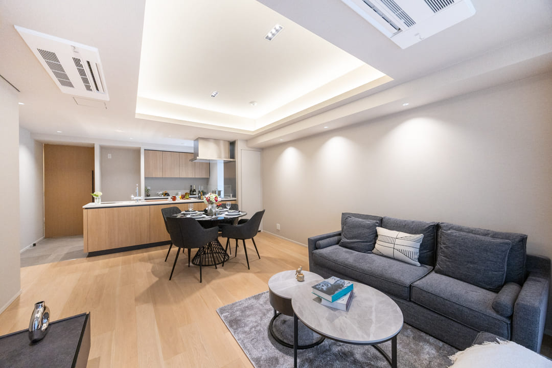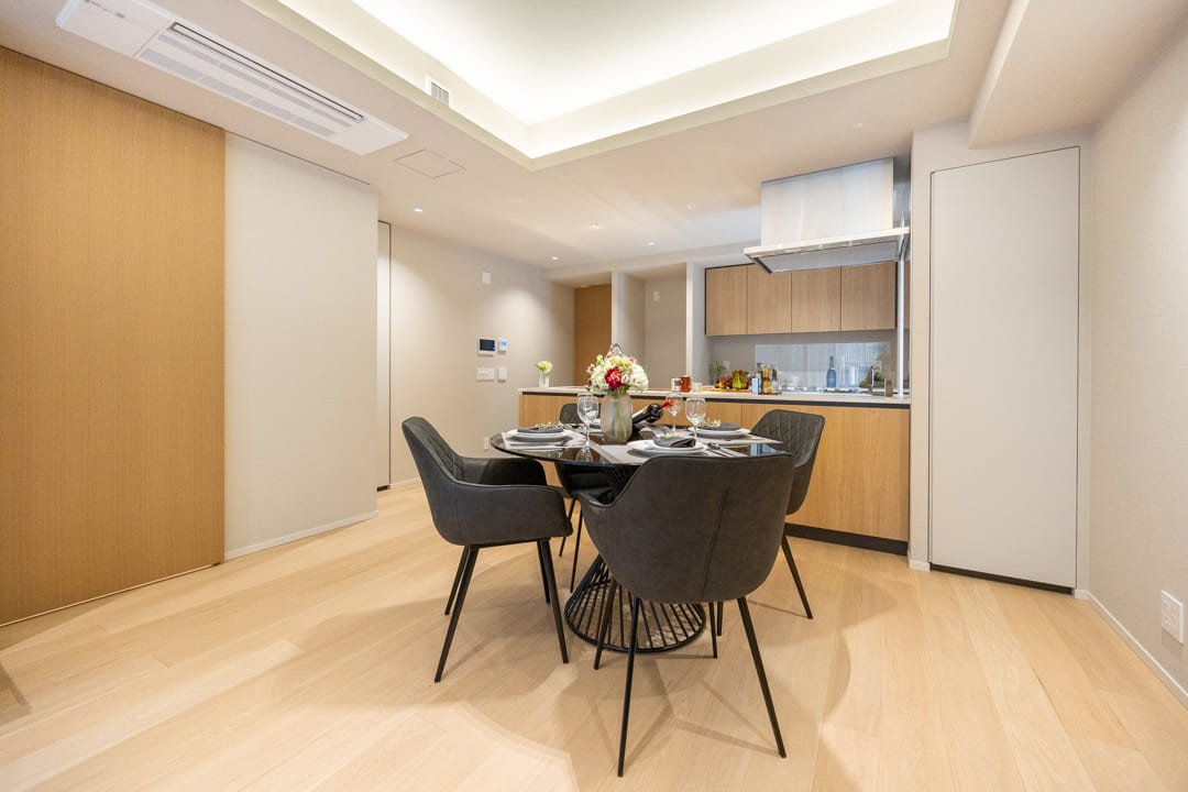 約18.9帖の広々としたリビングダイニングキッチンです。折り上げ天井による立体感。間接照明がやわらかく広がり、空間全体に落ち着きのある雰囲気をもたらしています。エアコンは、埋め込み式のためインテリアの邪魔をしないのも◎。また、生活感が出がちな小物を収納できる棚が2つも造られています。