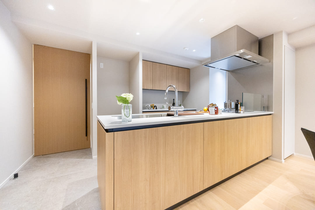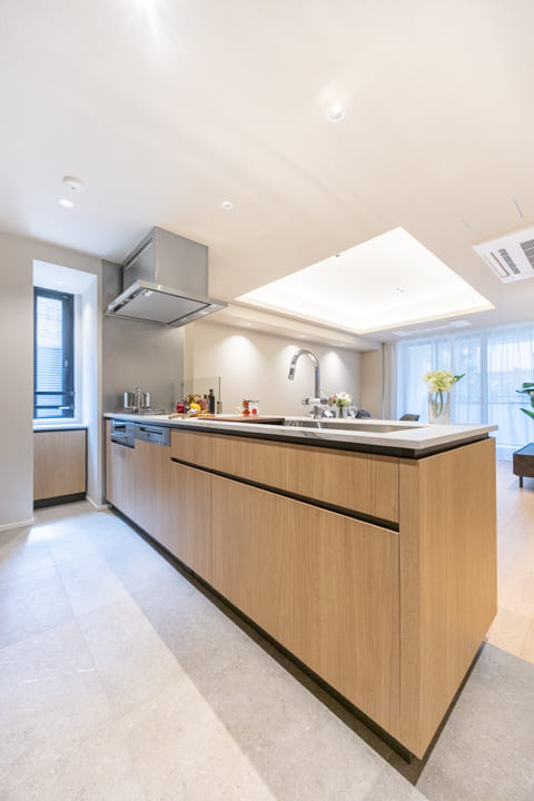 キッチンは、リビングダイニングを見渡しながら料理ができる対面式です。家族や来客とのコミュニケーションが取りやすくて◎。窓があるので換気がしやすく、明るさもプラスしてくれます。