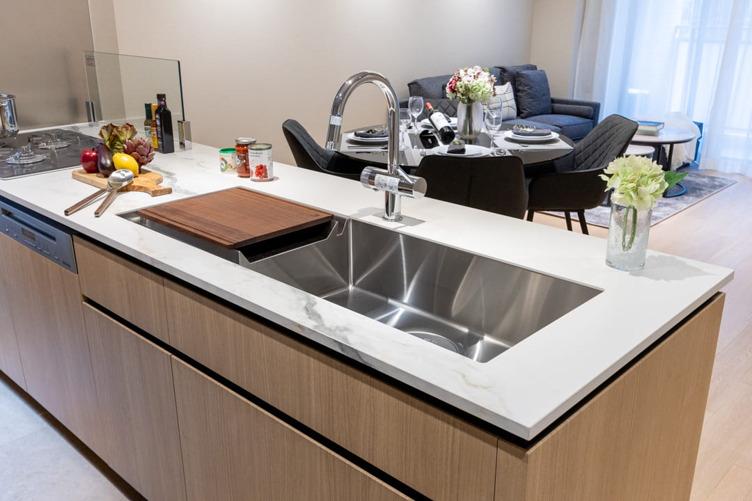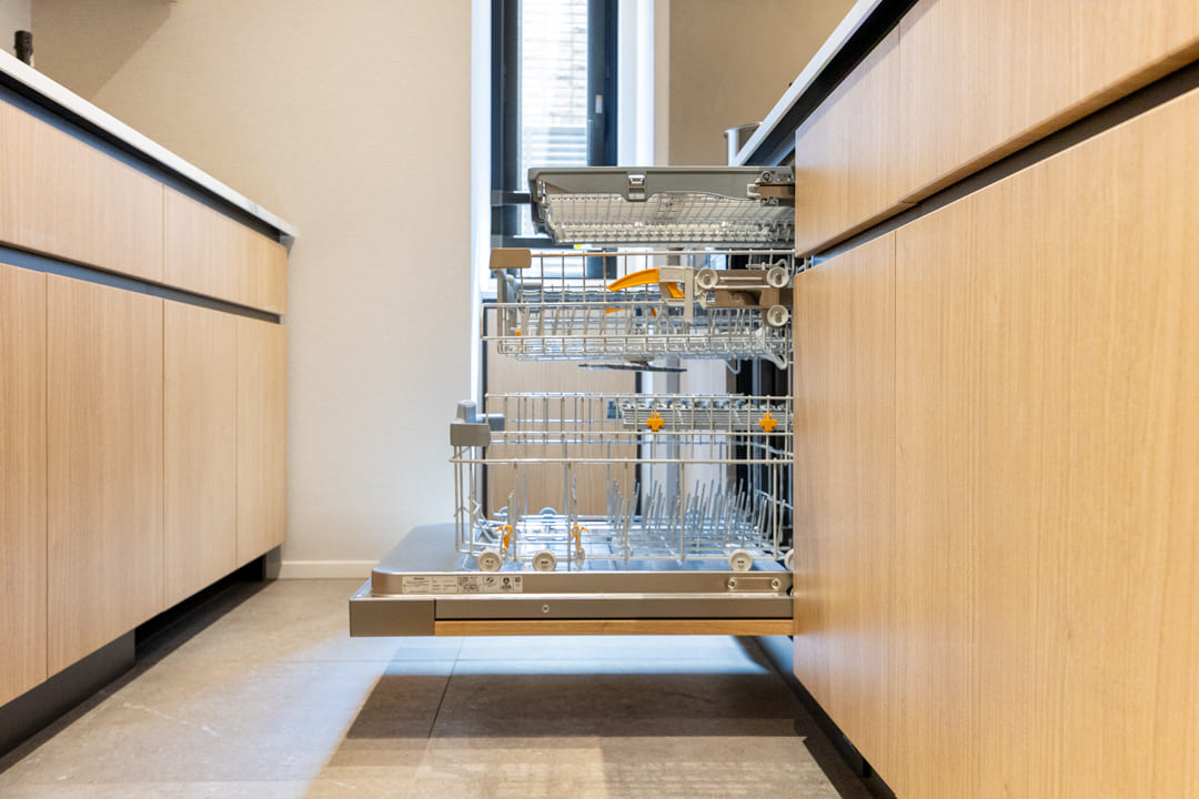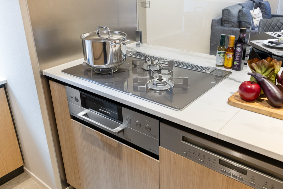 3口コンロ、グリル、ディスポーザー、食洗機付きと設備面も充実しています。食洗機はドイツの高級家電ブランドMiele(ミーレ)製の大型食洗機です。大きなサイズ感でパーティーや来客時での後片付けの負担を大幅に軽減してくれます。また、静音設計でマンションでも嬉しく、省エネ性能にも優れていますよ。