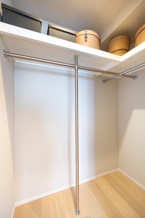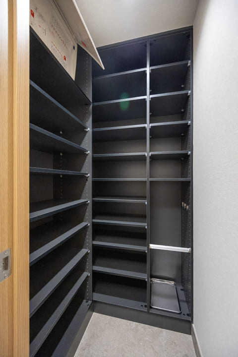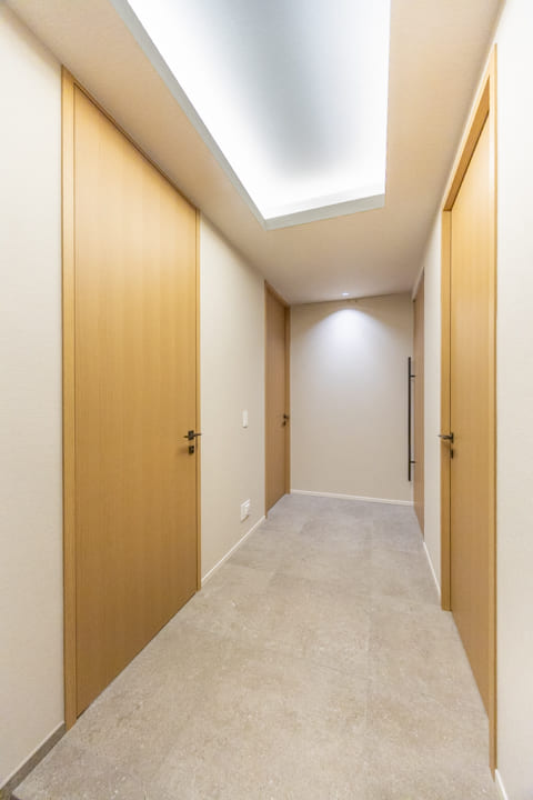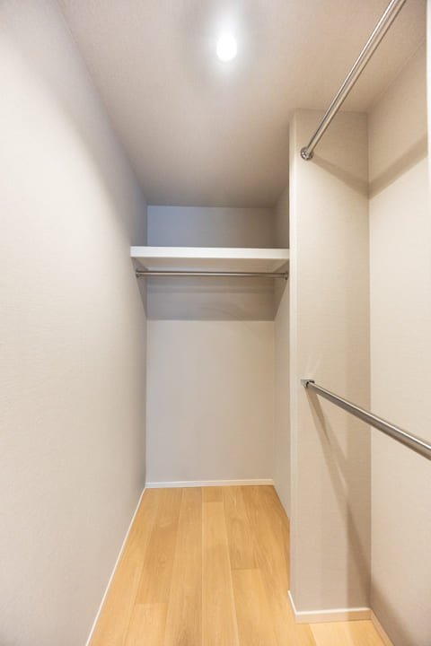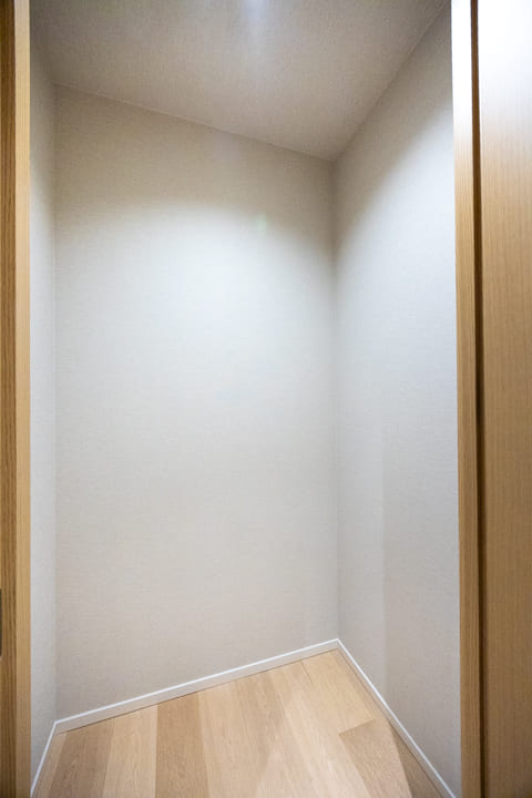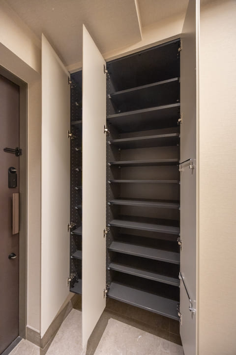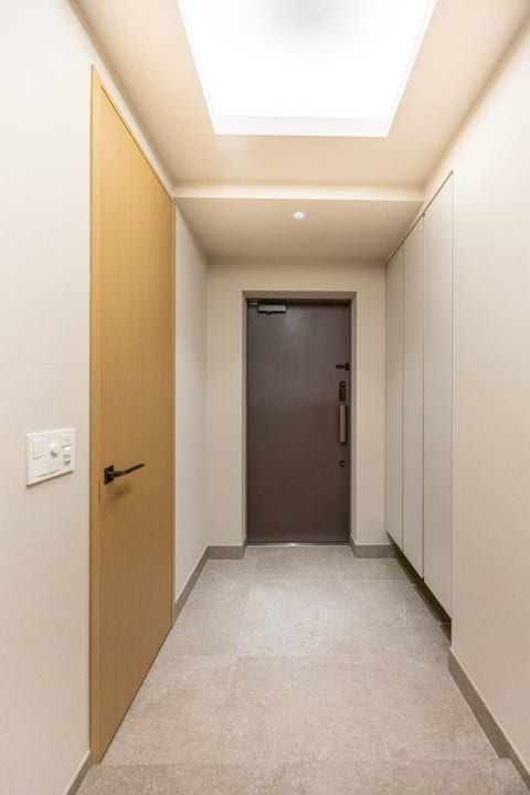 玄関は間接照明やタイルで上質な雰囲気を醸し出しています。高さのあるシューズボックスだけでなく、約0.8帖のシューズインクローゼットも造られており、収納スペースが豊富に確保されていて◎。