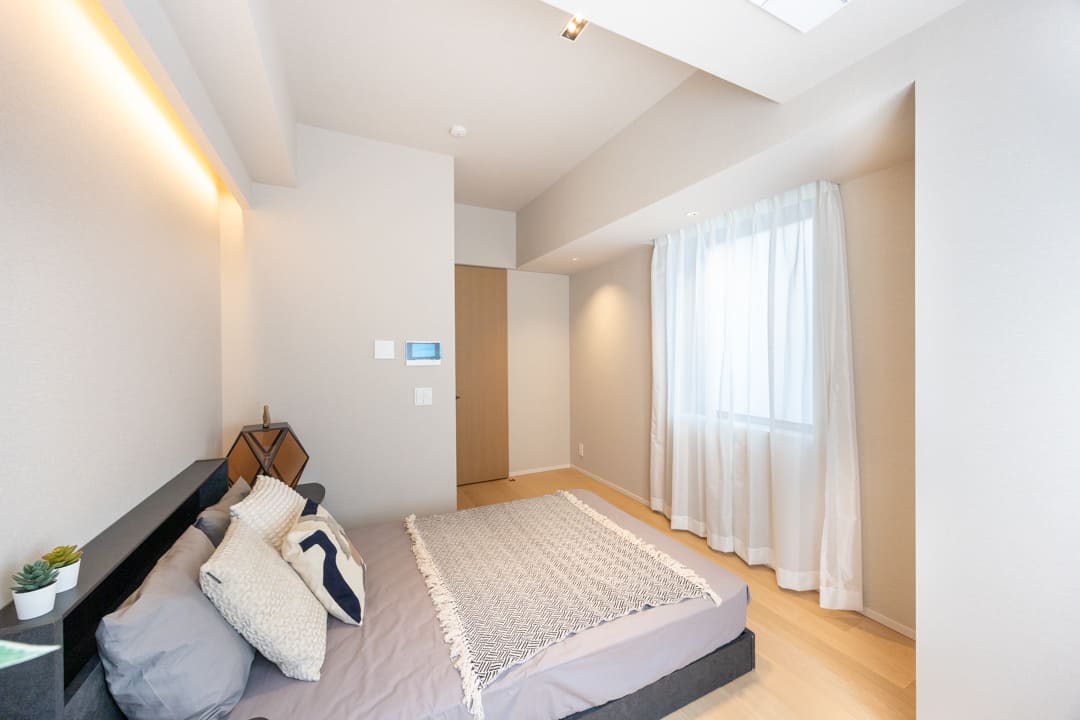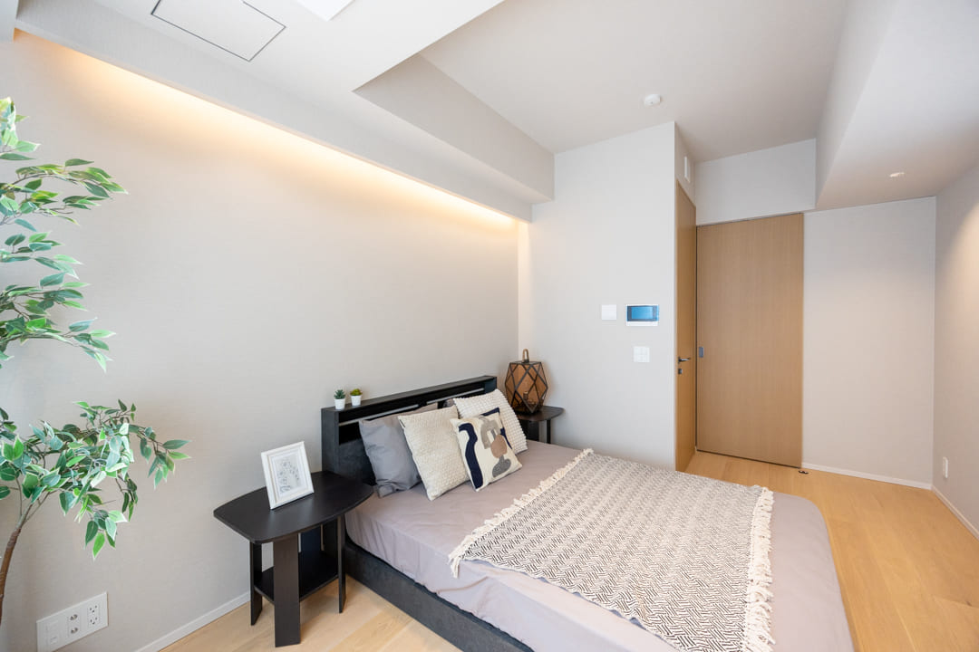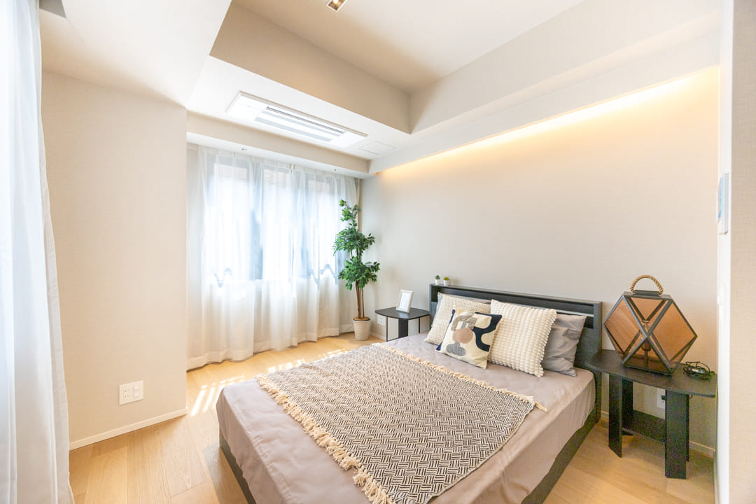 約8.1帖の主寝室は、二面採光で通風が良好です。間接照明があしらわれていて、寛ぎの空間を演出してくれています。また、床暖房も完備されているので、冬場でも足元から温まることができますよ。さらに、約1.0帖のウォークインクローゼットが造られているため、洋服などもすっきりと収納できます。
