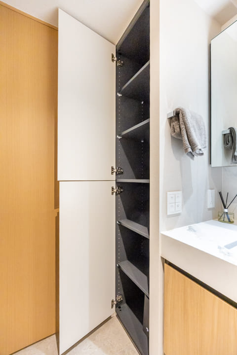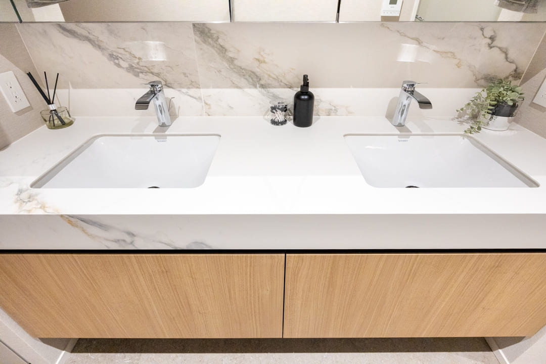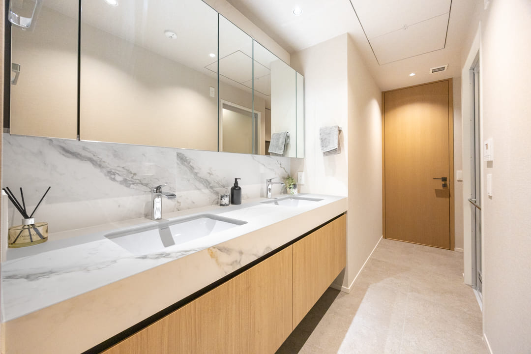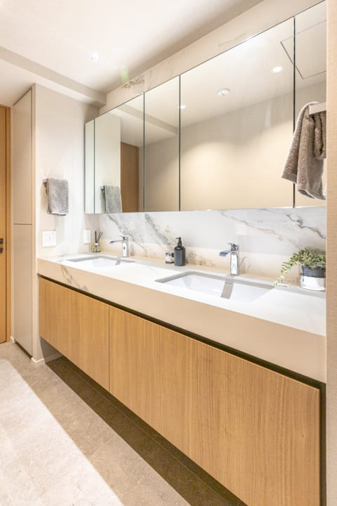 ホテルライクな2ボウル洗面の化粧台です。忙しい朝でも並んで支度ができるので使い勝手も良好。大きなミラーボックスの中には化粧品なども収納できます。横にはリネン庫が造られており、ごちゃごちゃしがちな洗面まわりをきちんと整頓させることが可能です。