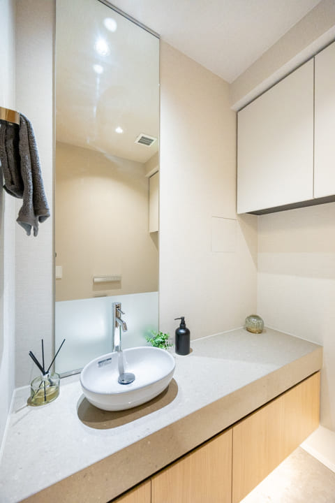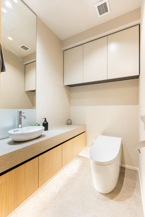 ウォシュレット一体型のトイレです。タンクレスタイプなのですっきりとした印象に。また、別途で手洗い器と鏡が造られているので、その場でサッと身だしなみを整えることができます。上部には吊戸棚が設置されていて、収納スペースもありますよ。カウンタースペースにはアロマなどを置いても◎。