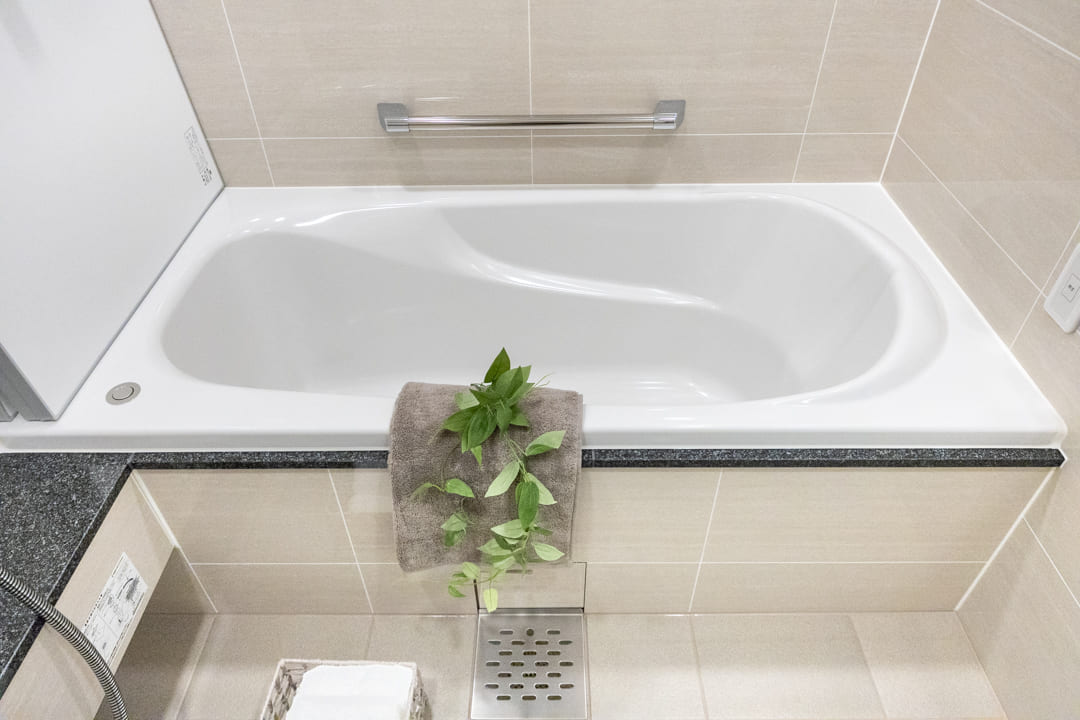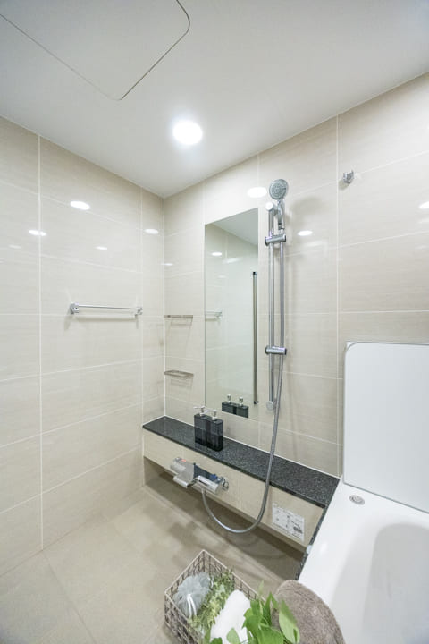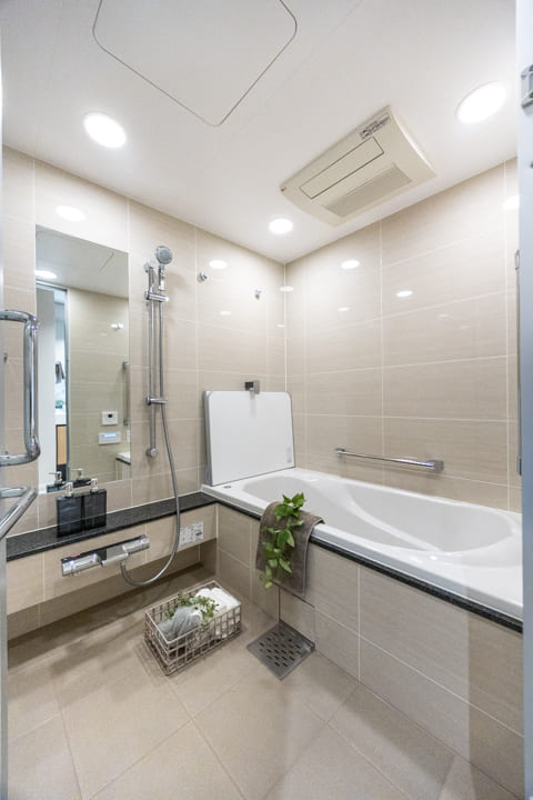 ベージュトーンでまとめられた落ち着いた印象のバスルームです。お風呂にゆっくり浸かるのが好きという方に嬉しい追い焚き機能を搭載。家族の入浴時間がずれてしまっても安心です。また、浴室乾燥機には暖房・乾燥・換気・ミストサウナの機能がついており、一年中快適に過ごすことができます。