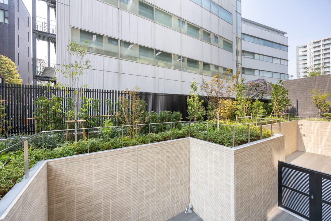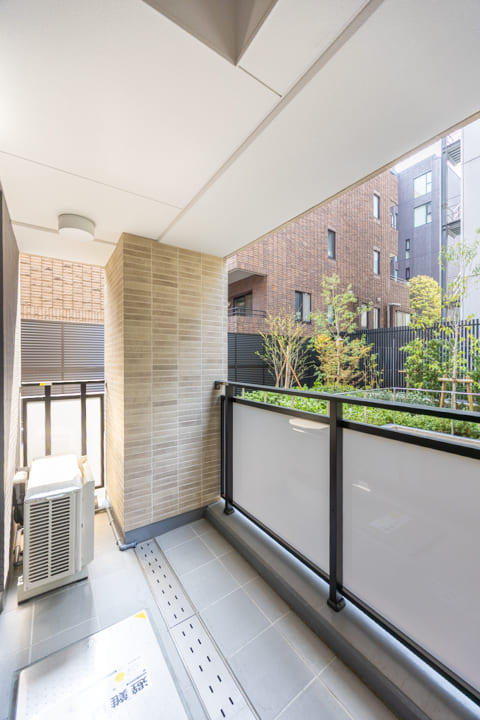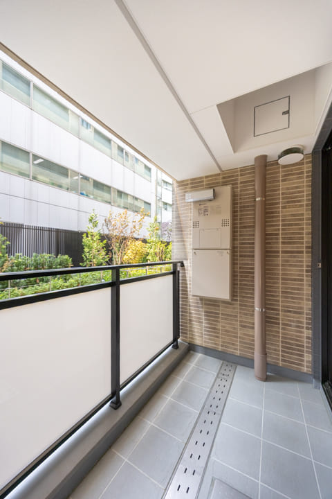 約5.60㎡のバルコニーは、南西向きのため日当たりが良好です。床のグレーのタイルは汚れが目立ちにくく、かつスタイリッシュな印象。お部屋は1階部分ですが、道路に面していないため外部からの視線が直接届きにくくなっています。