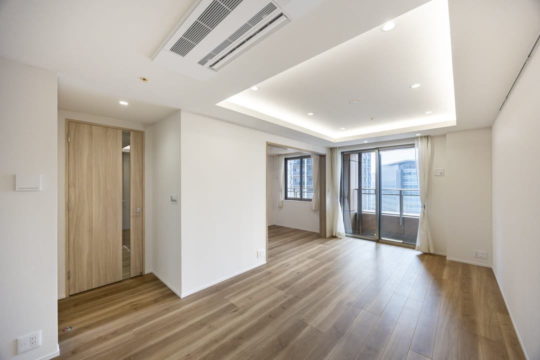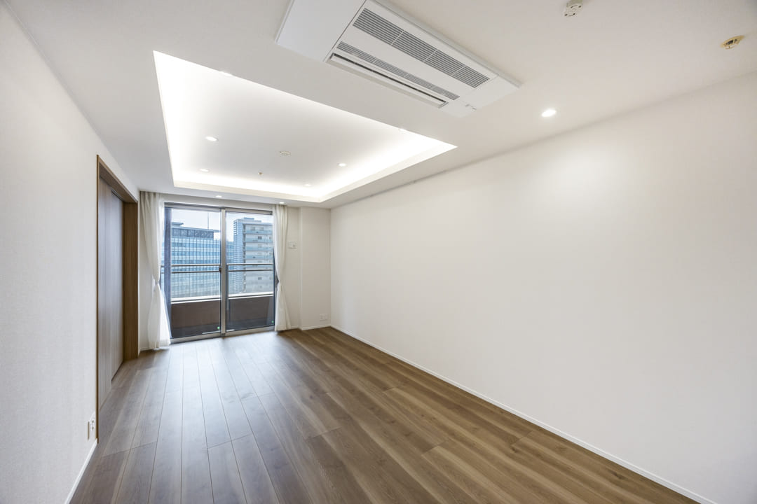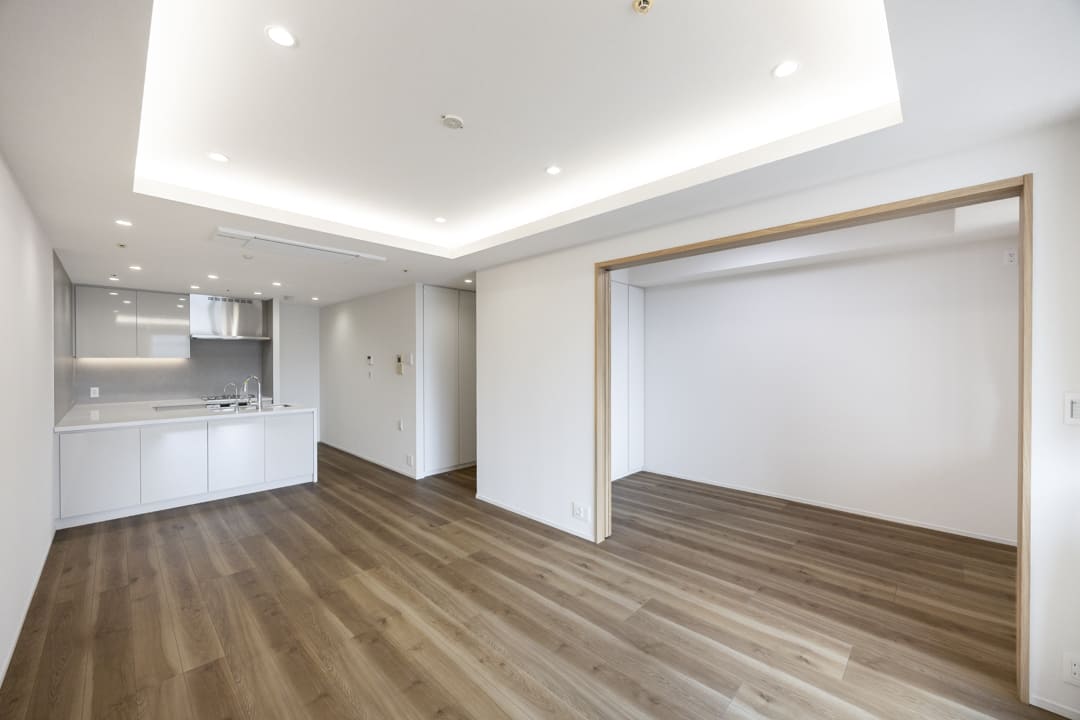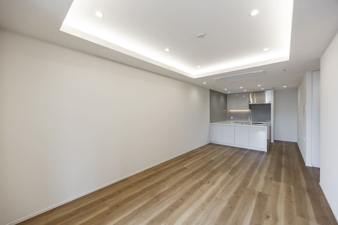 約16.5帖の広々としたリビングダイニングキッチンです。南向きのため日当たりが良好。折り上げ天井には間接照明があしらわれていて、上品な雰囲気が漂っています。また、入口には生活感が出がちな小物をすっきりと収納できる棚が造られています。