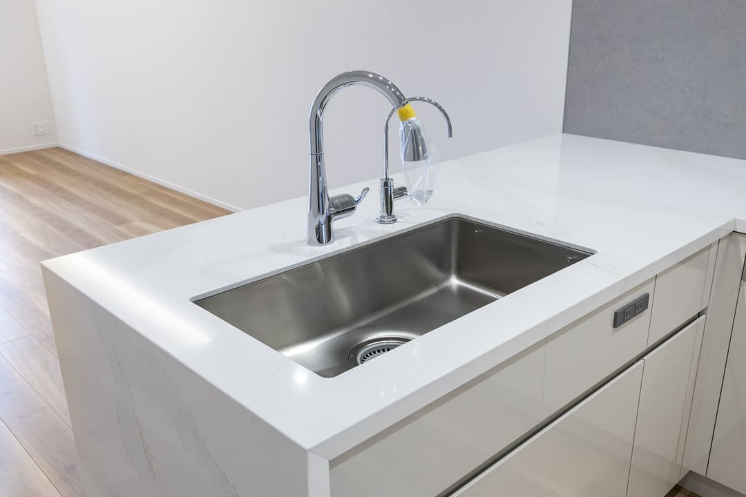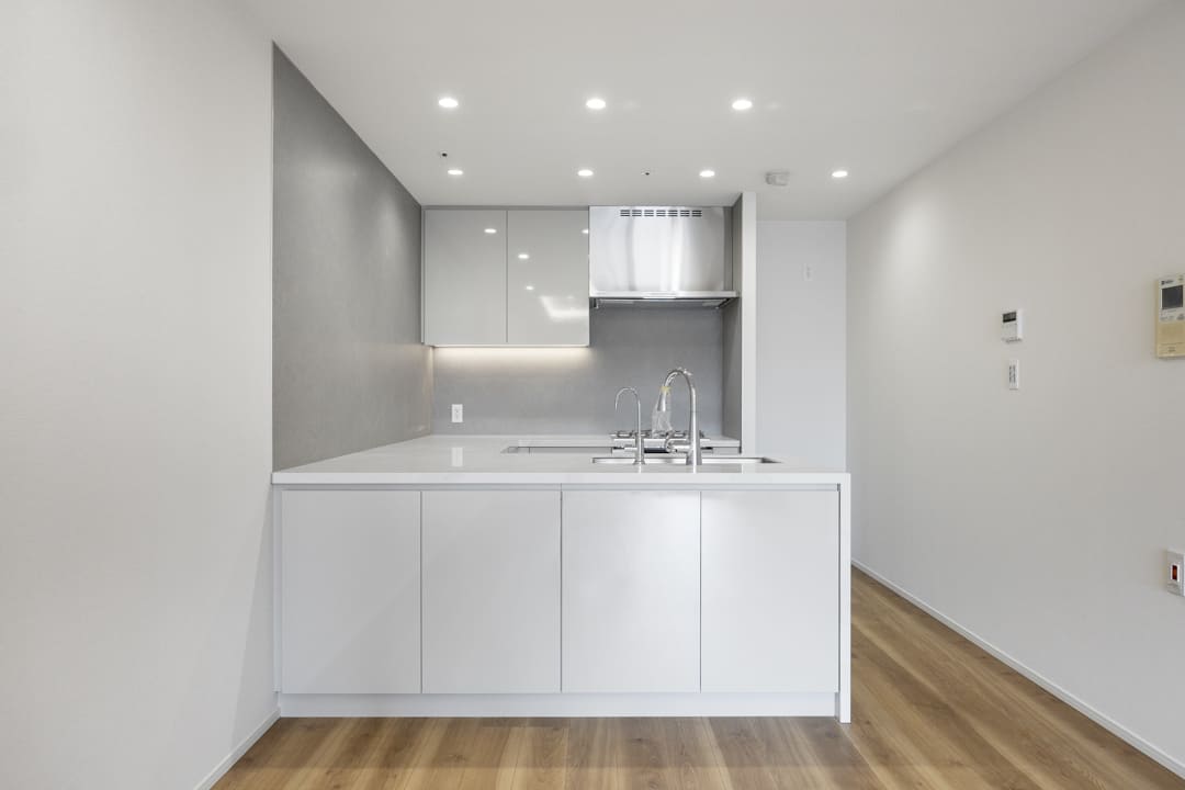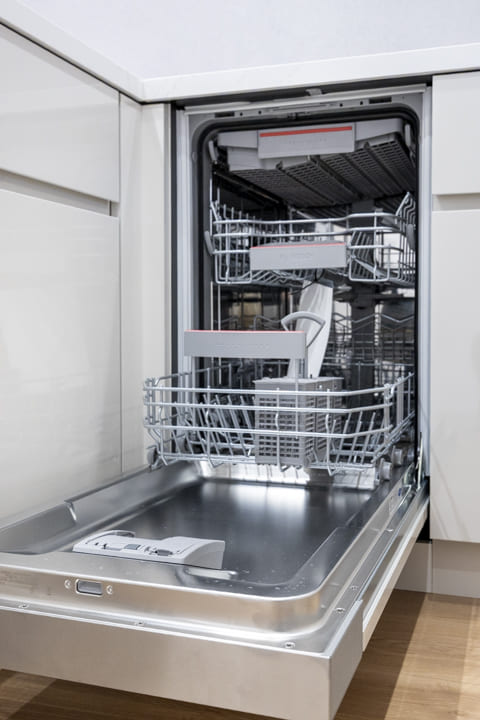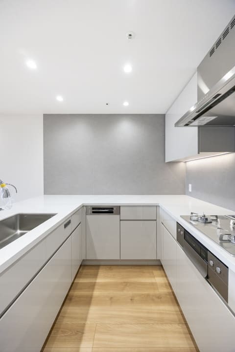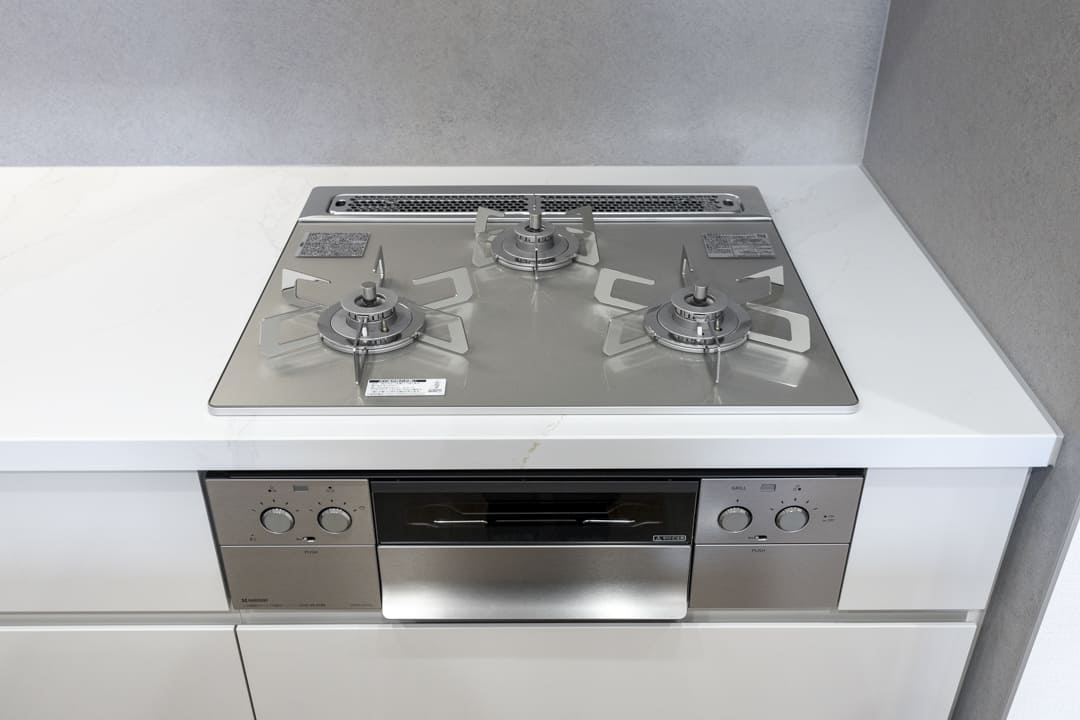 3口コンロ、グリル、大型食洗機付きと設備面も充実しています。食洗機はドイツの家電メーカーBOSCH製の大型食洗機で、しつこい汚れも予洗いが不要。節水効果もあるので家計にも優しいですよ。