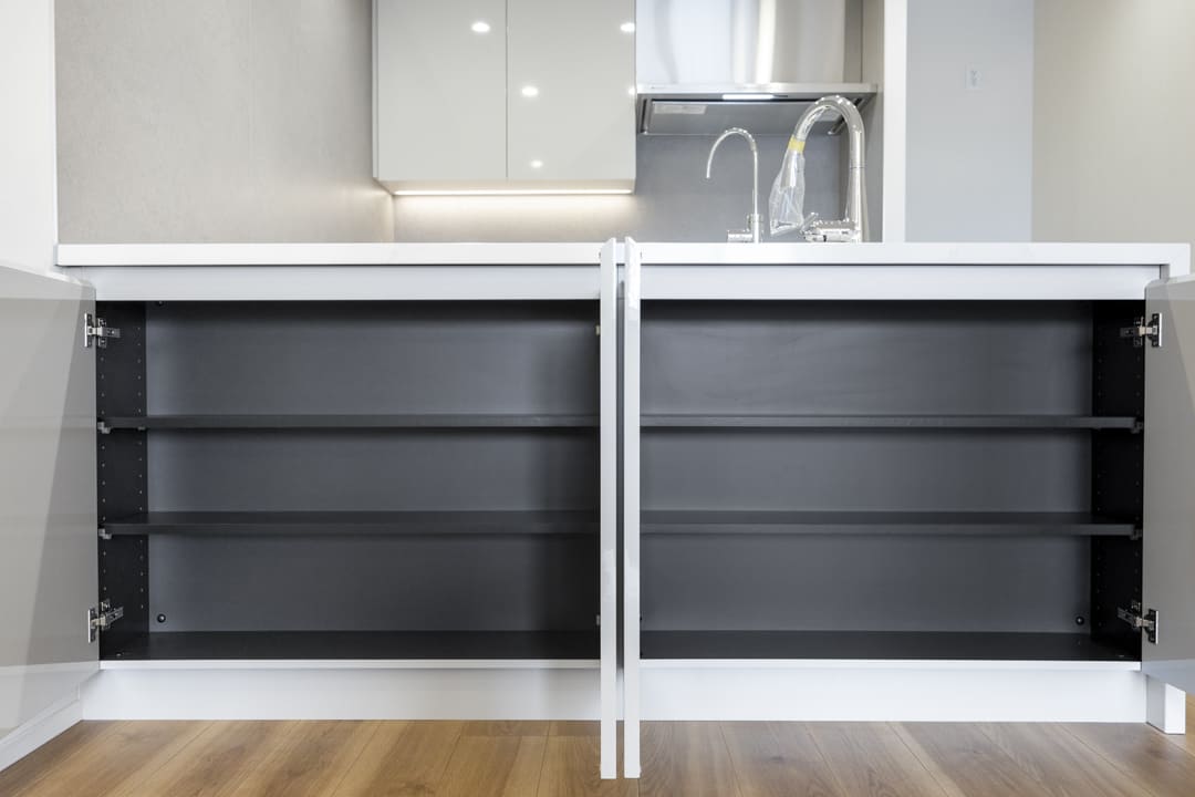 キッチンは、動線が最小限に済んで料理が捗るコの字型です。作業スペースや収納スペースも広めに取れて使い勝手良好。また、対面式にもなっているので、家族やゲストとのコミュニケーションが取りやすくなっています。リビングダイニング側には小物が収納できるのも便利で◎。