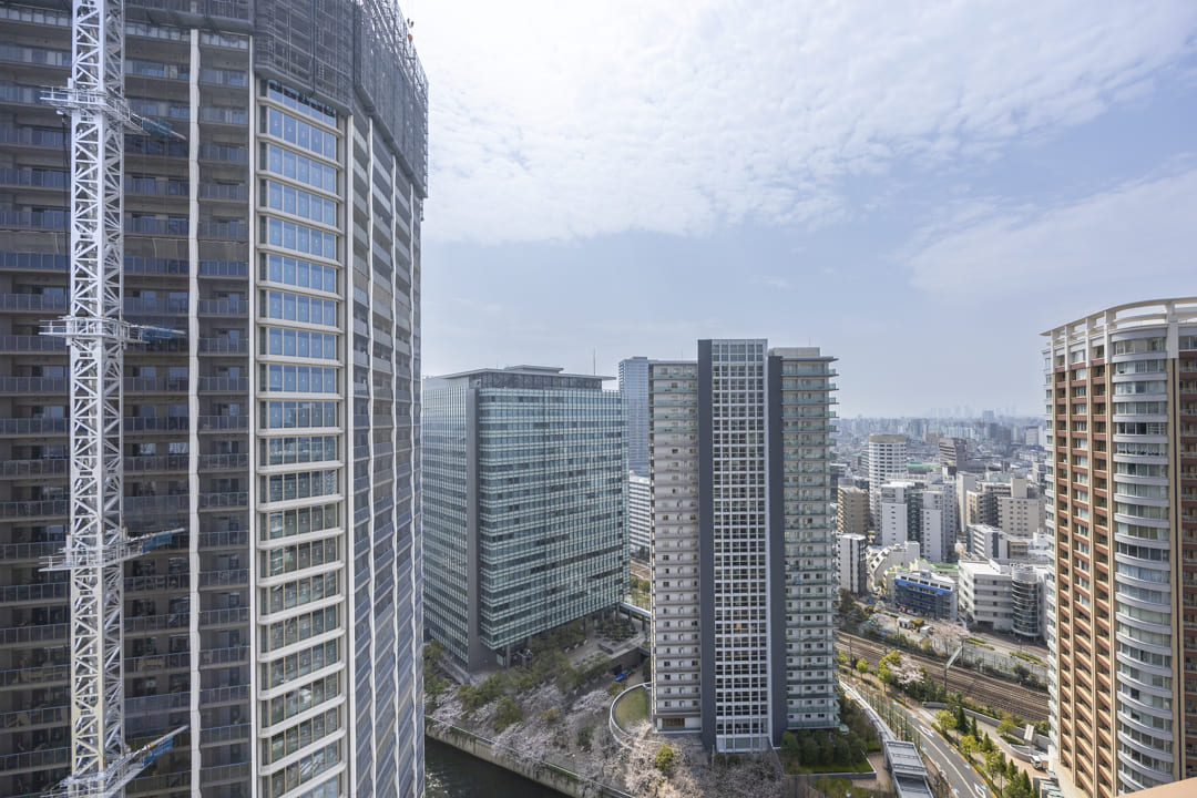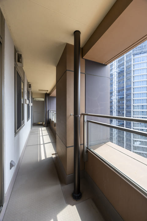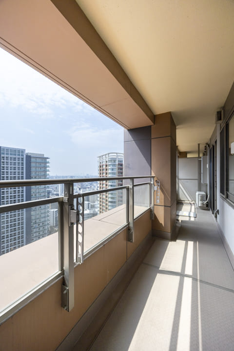 約14.47㎡の広々としたバルコニーは南向きのため日当たりが良好です。チェアなどを置いてほっと一息ついても◎。目の前には都心のビル群を望みながら、目黒川の水の潤いや桜の美しさも楽しめます。