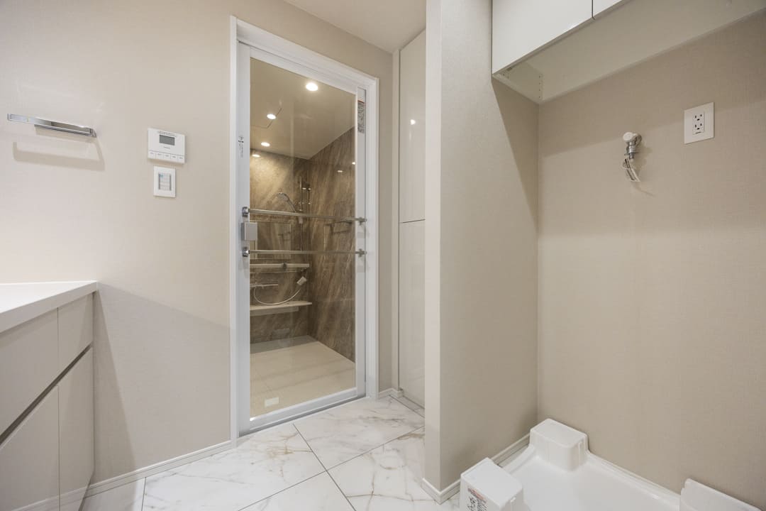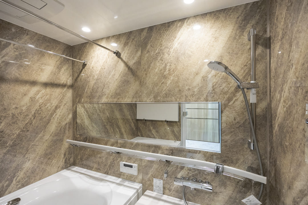 1620サイズでゆったりと入浴できるバスルームです。ワイドミラーで奥行きがあり、お風呂にゆっくり浸かるのが好きという方に嬉しい追い焚き機能を搭載。家族の入浴時間がずれてしまっても安心です。浴室乾燥機には暖房・乾燥・換気・涼風の機能がついており、一年中快適に過ごすことができます。