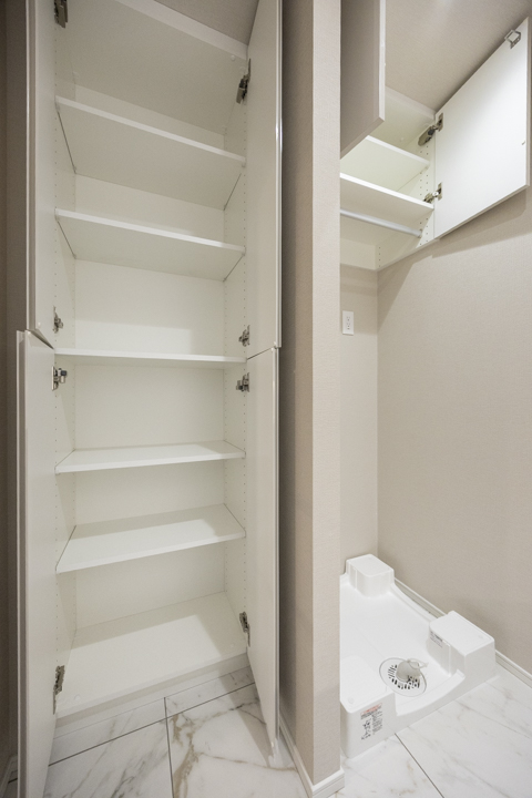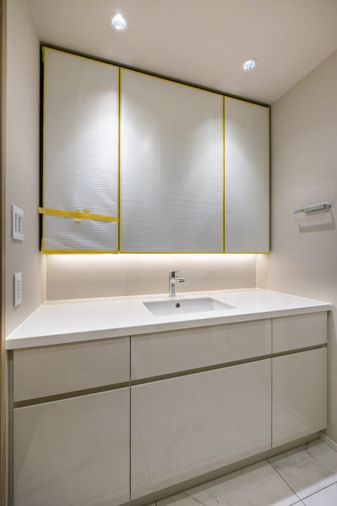 三面鏡の中には化粧品などを収納できて使い勝手良好な化粧台です。広めのカウンターで身支度もしやすくなっています。背面側にはリネン庫が造られており、ごちゃごちゃしがちな洗面まわりをきちんと整頓させることができます。