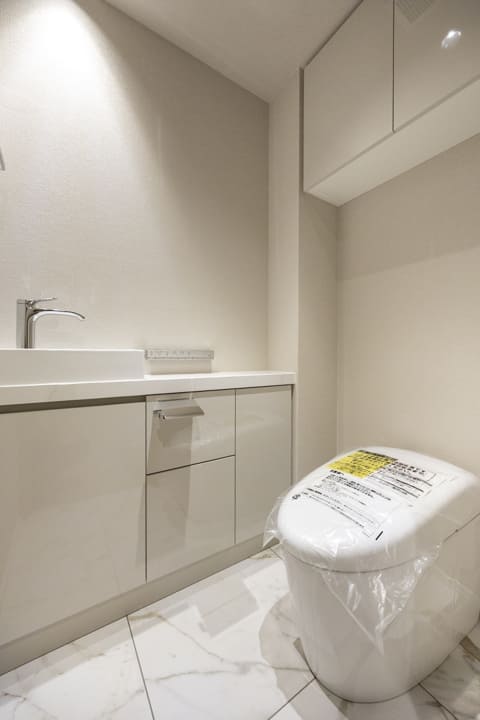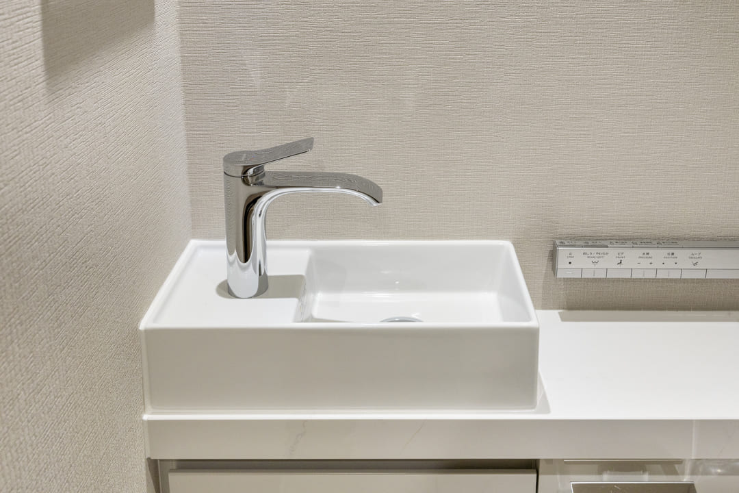 ウォシュレット一体型のトイレです。タンクレスタイプなのですっきりとした印象に。また、別途で手洗い器が造られているので、すぐに手を洗うことができて衛生的です。上部には吊戸棚が設置されていて、収納スペースもありますよ。カウンタースペースにはアロマなどを置いても◎。