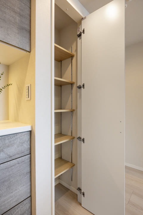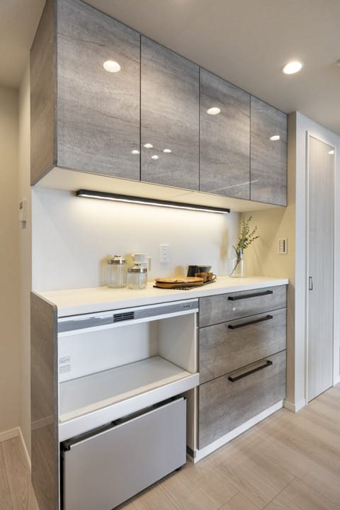 キッチンの背面側にはカップボードが備え付けられています。調味料や食器などを収納できるだけでなく、電子レンジなどを置くこともできるので便利です。ゴミ箱を収納するスペースもあるので、使わない時は隠しておくことができますよ。