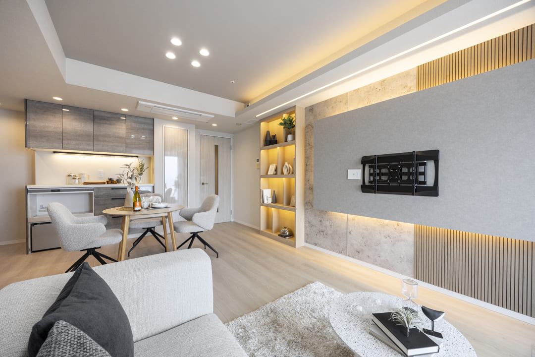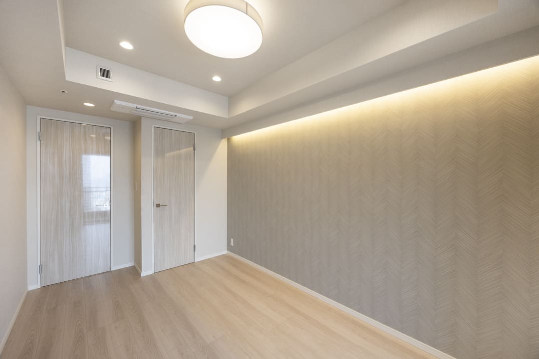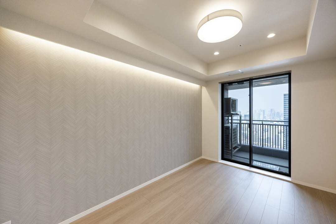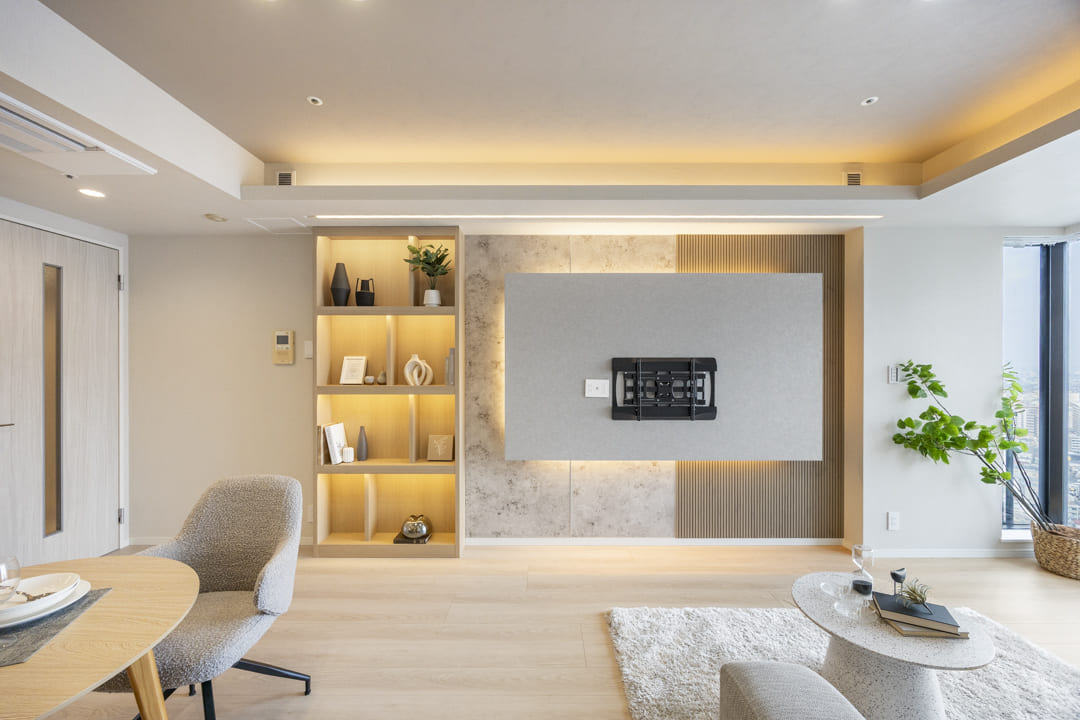 壁面や天井には間接照明があしらわれていて、上品な雰囲気が漂っています。さらに、アクセントボードやクロスで上質感もプラス。壁掛けテレビが設置できるようになっているのも嬉しいですね。また、エアコンは埋め込み式のためインテリアの邪魔をしません。