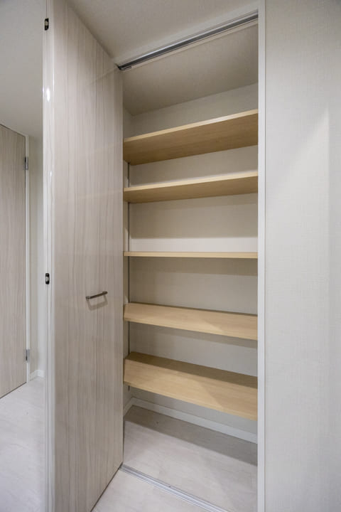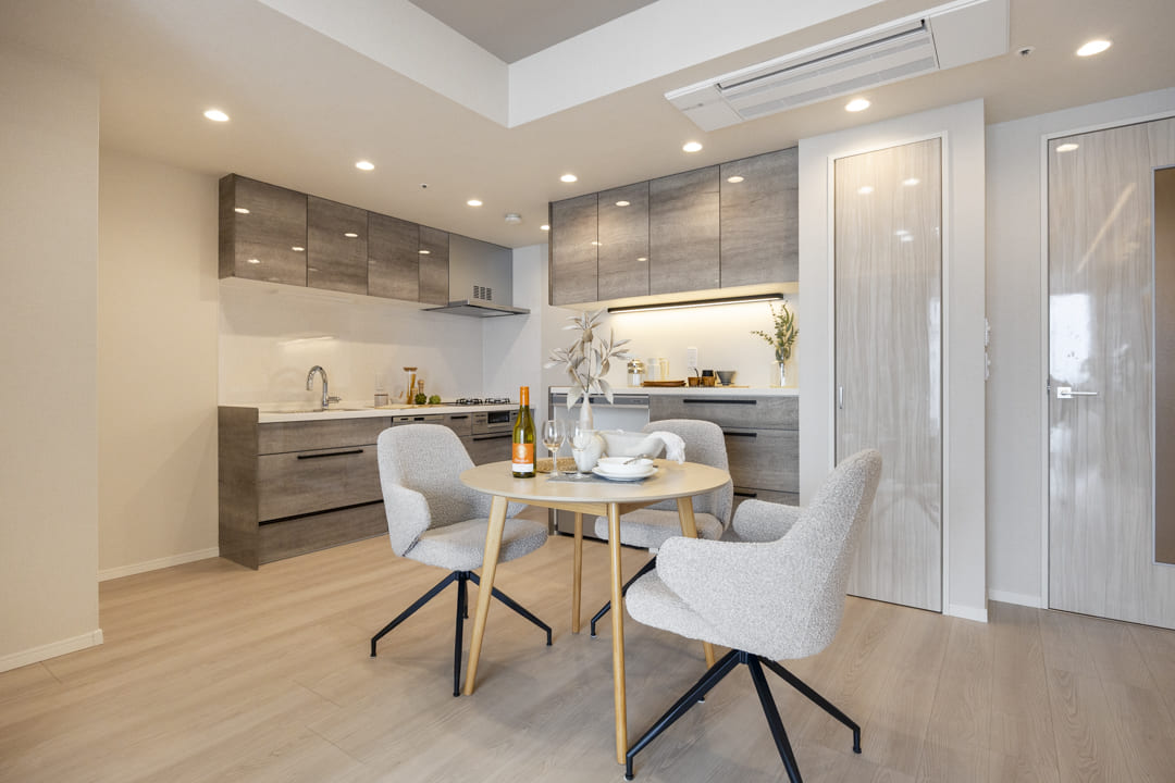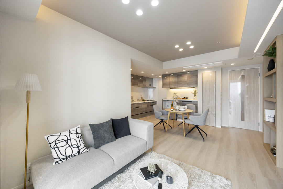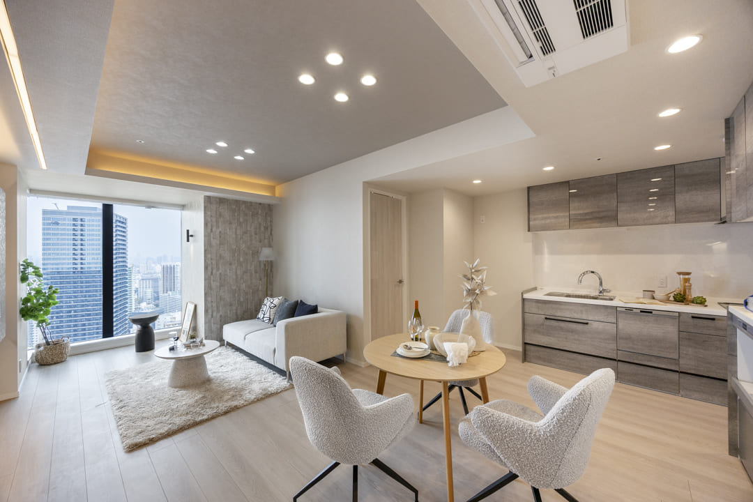 約17.0帖の広々としたリビングダイニングキッチンです。北西側にはL字の大きな窓があります。そこからは広がる空と連続する街並みが自然につながり、室内にいながら外の空気感を感じられるような抜け感のある眺望が楽しめます。また、入口には棚が造られているので、生活感が出がちな小物を収納することができますよ。
