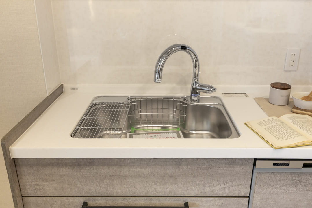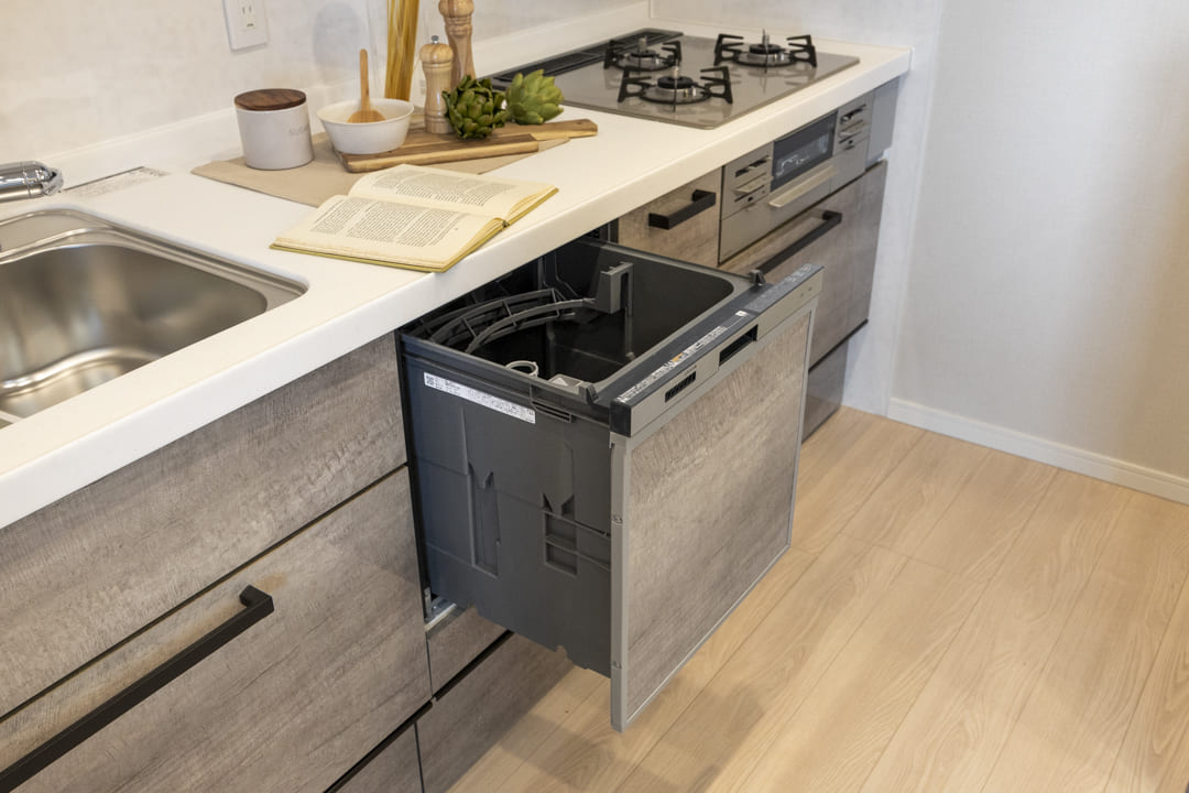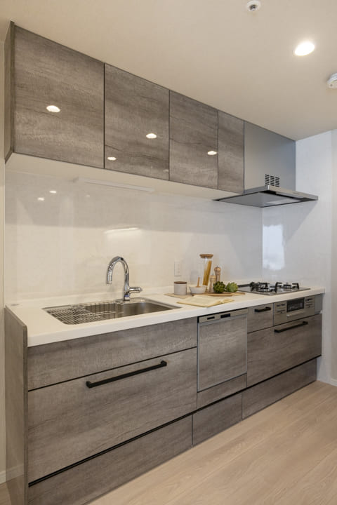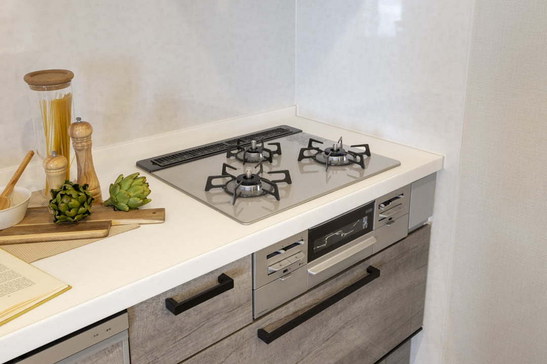 まるで家具のようにおしゃれな壁付けキッチンです。3口コンロ、グリル、食洗機付きと設備面も充実しています。シンクも広々としているので野菜などが洗いやすそうですよ。また、作業スペースにはコンセントがあるので、ミキサーなどのキッチン家電も使いやすくなっています。